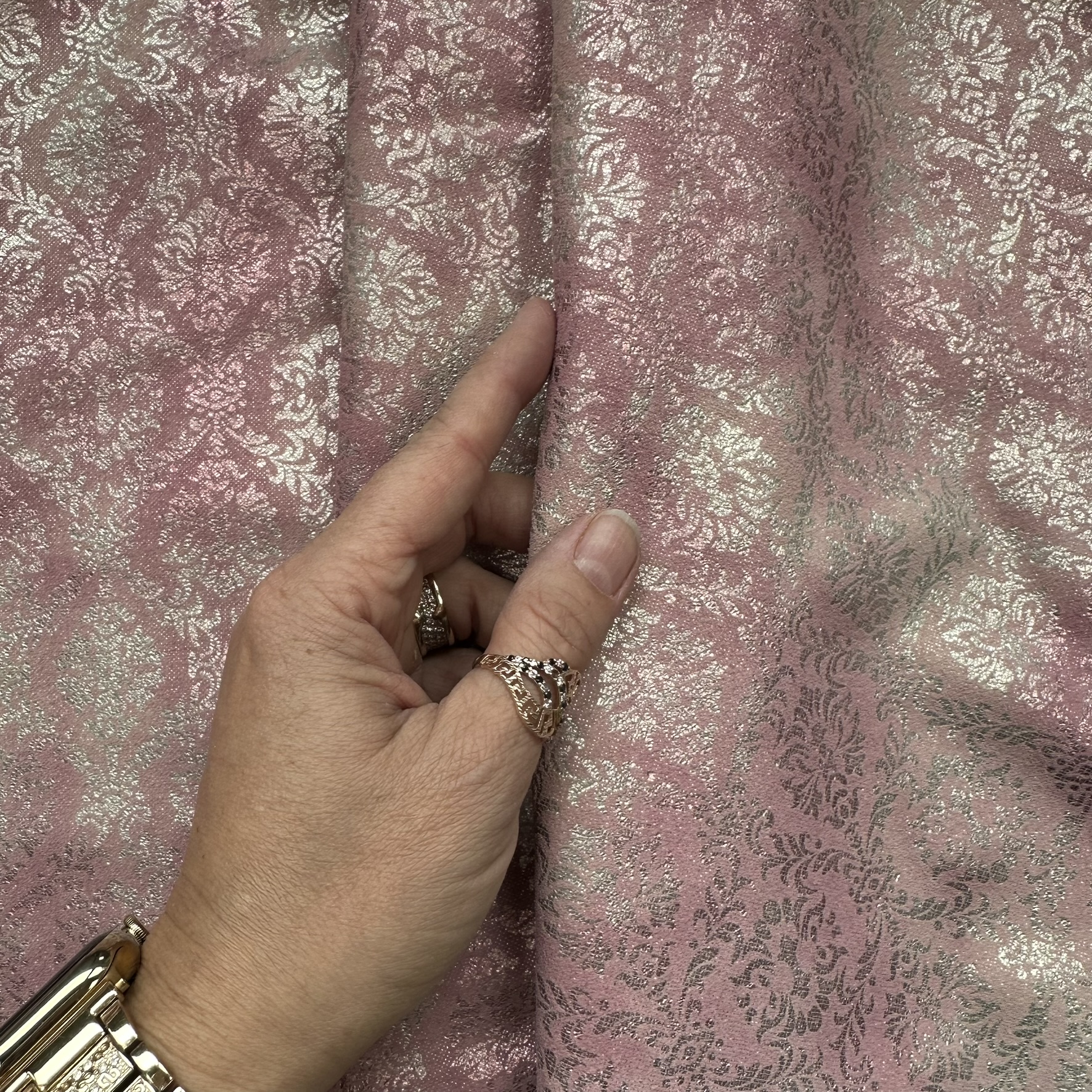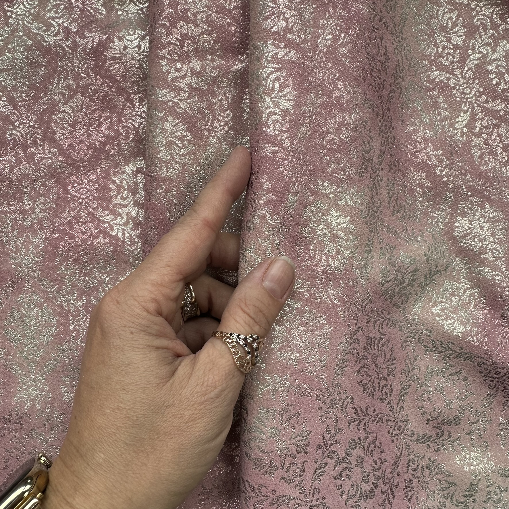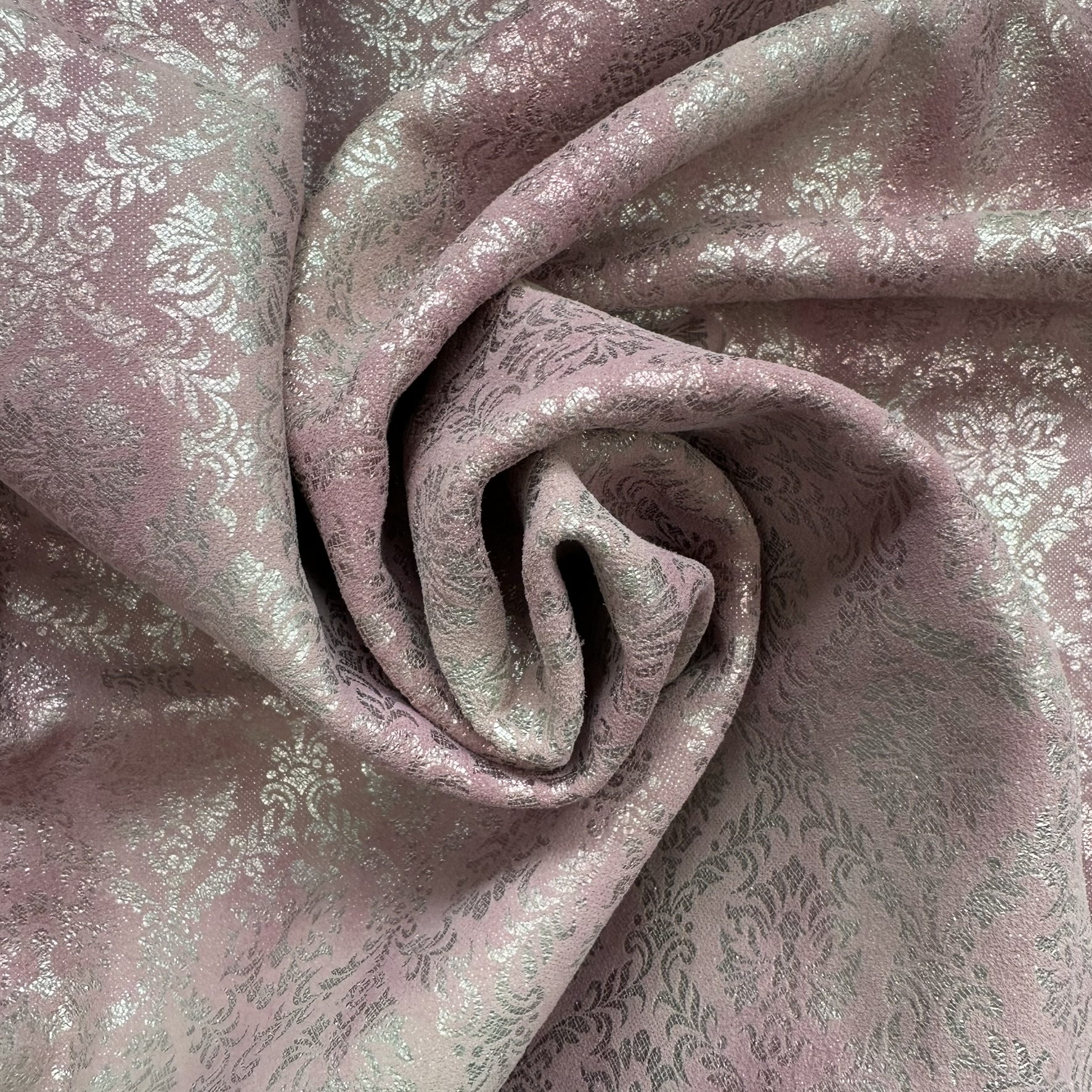 Dieses feine Veloursleder begeistert mit einem barocken Ornamentmuster in edlem Silber-Metallic auf zartem Roségrund. Das dezente Glitzern bei Lichteinfall verleiht dem Leder eine besonders feminine Ausstrahlung – ideal für Designs mit Vintage-Flair und romantischem Charme.