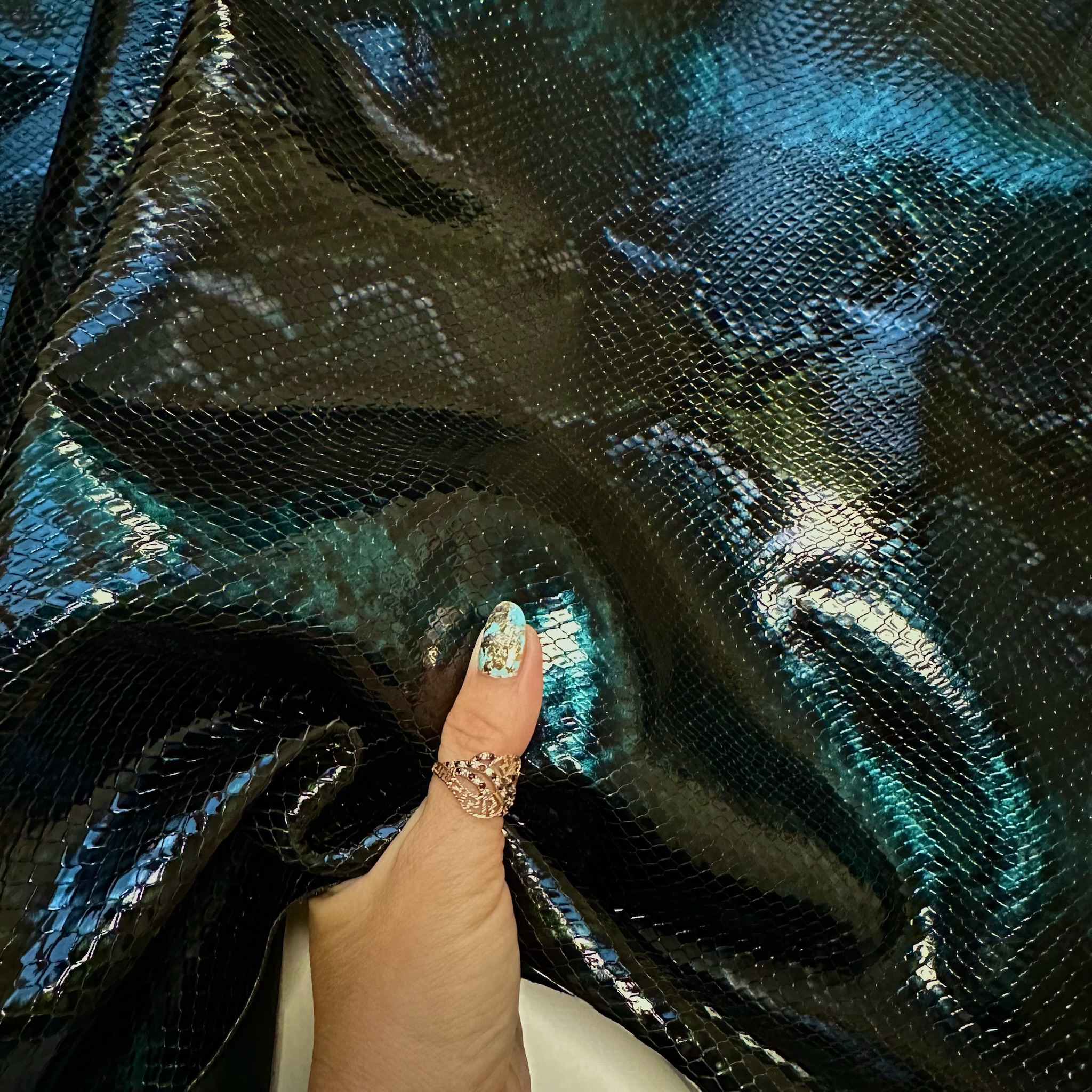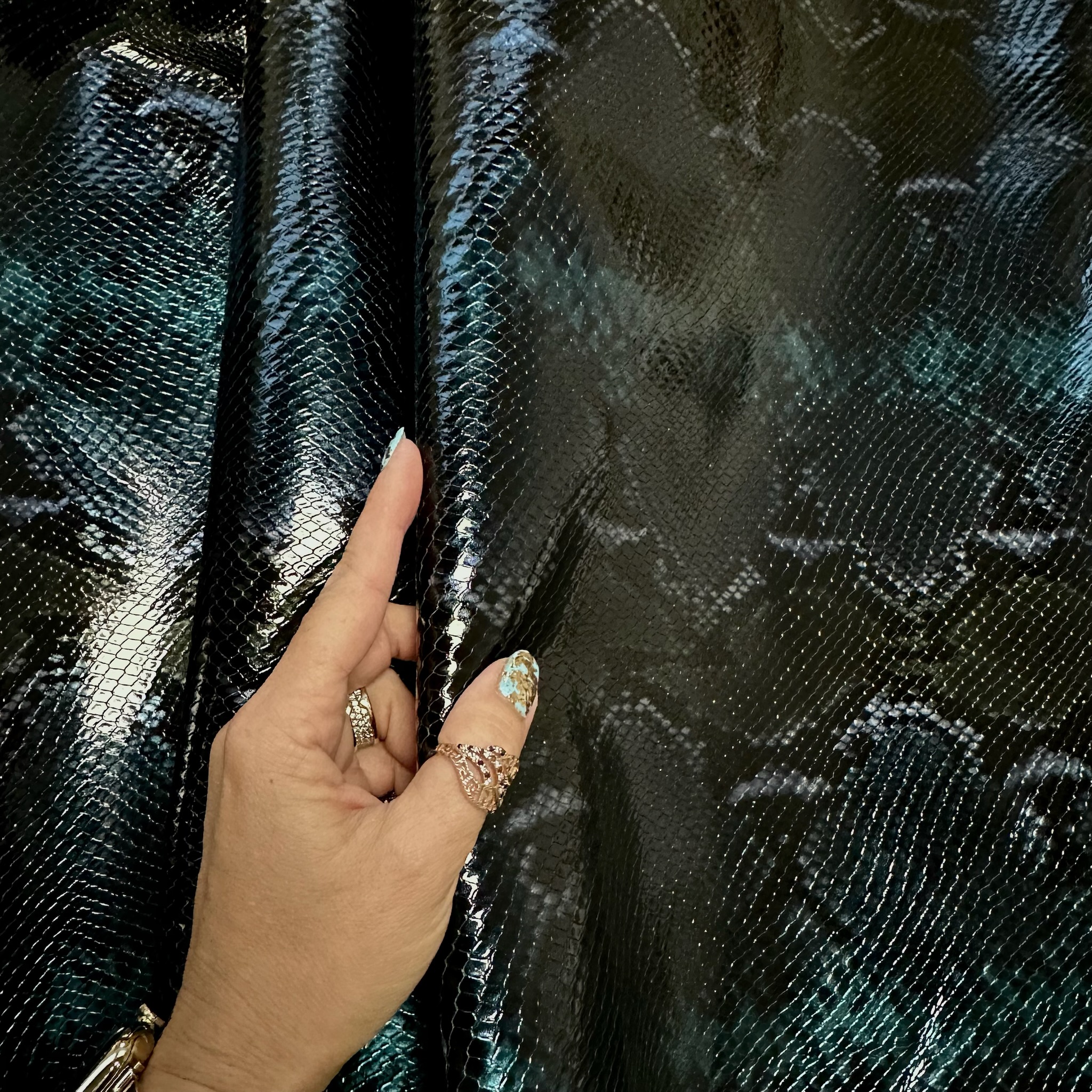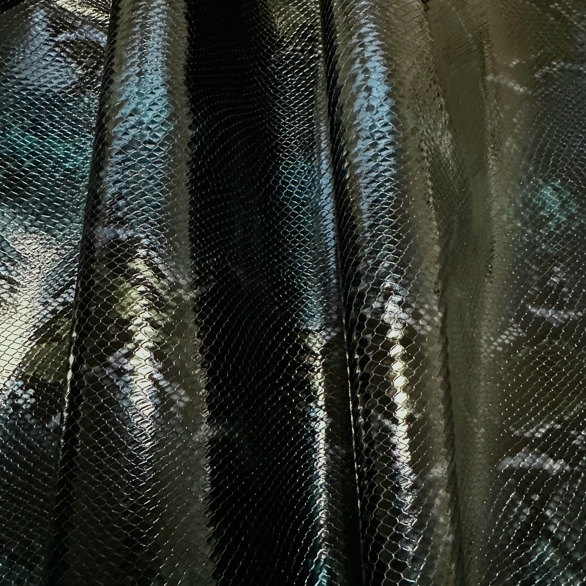 Dieses extravagante Rindleder verbindet eine feine 3D-Prägung in Schlangenoptik mit einem tief glänzenden Lack-Finish. Der metallisch schimmernde Farbverlauf in Petrol, Türkis und Schwarz erzeugt einen marmorierten Effekt, der je nach Lichteinfall changiert. Ideal für anspruchsvolle Taschen-, Schuh- oder Interior-Designs mit starkem Ausdruck.