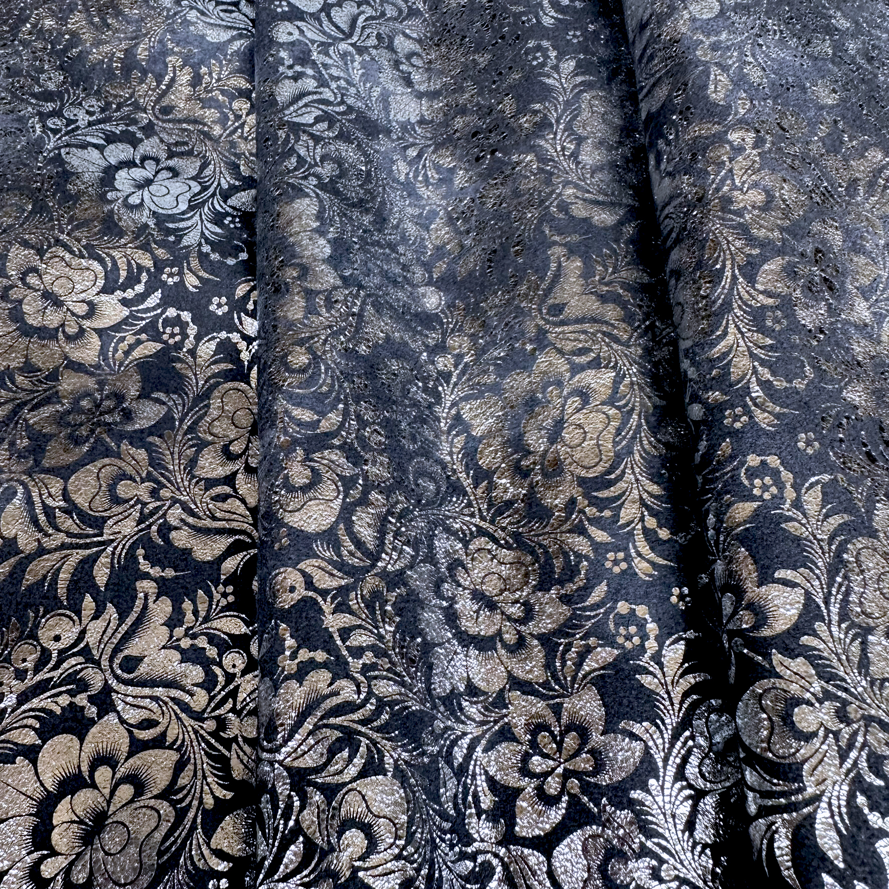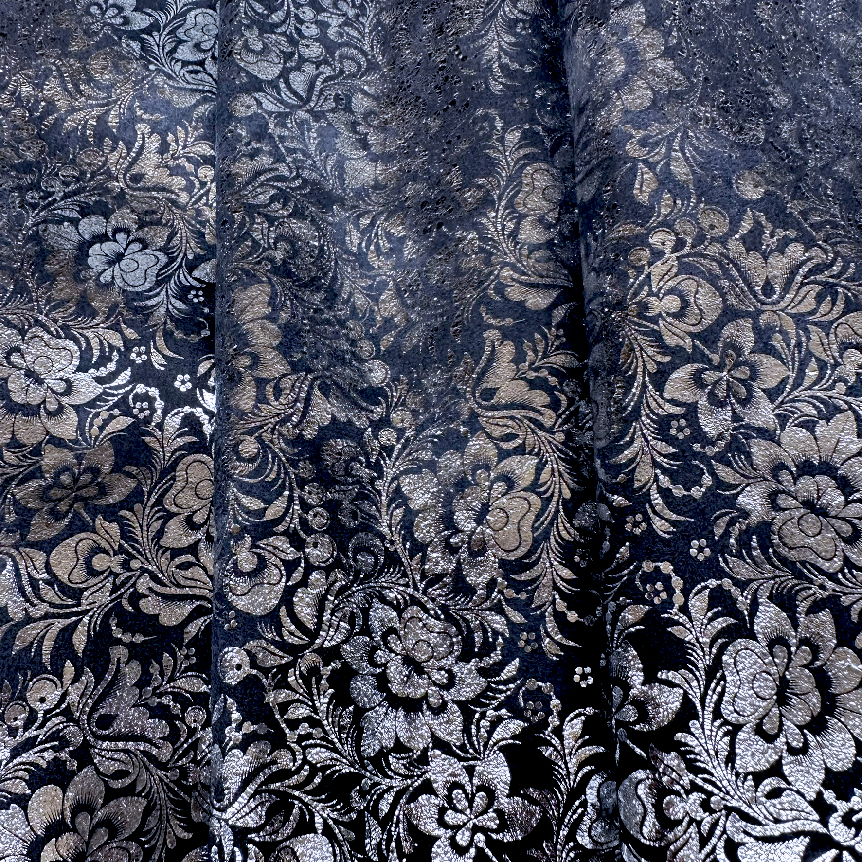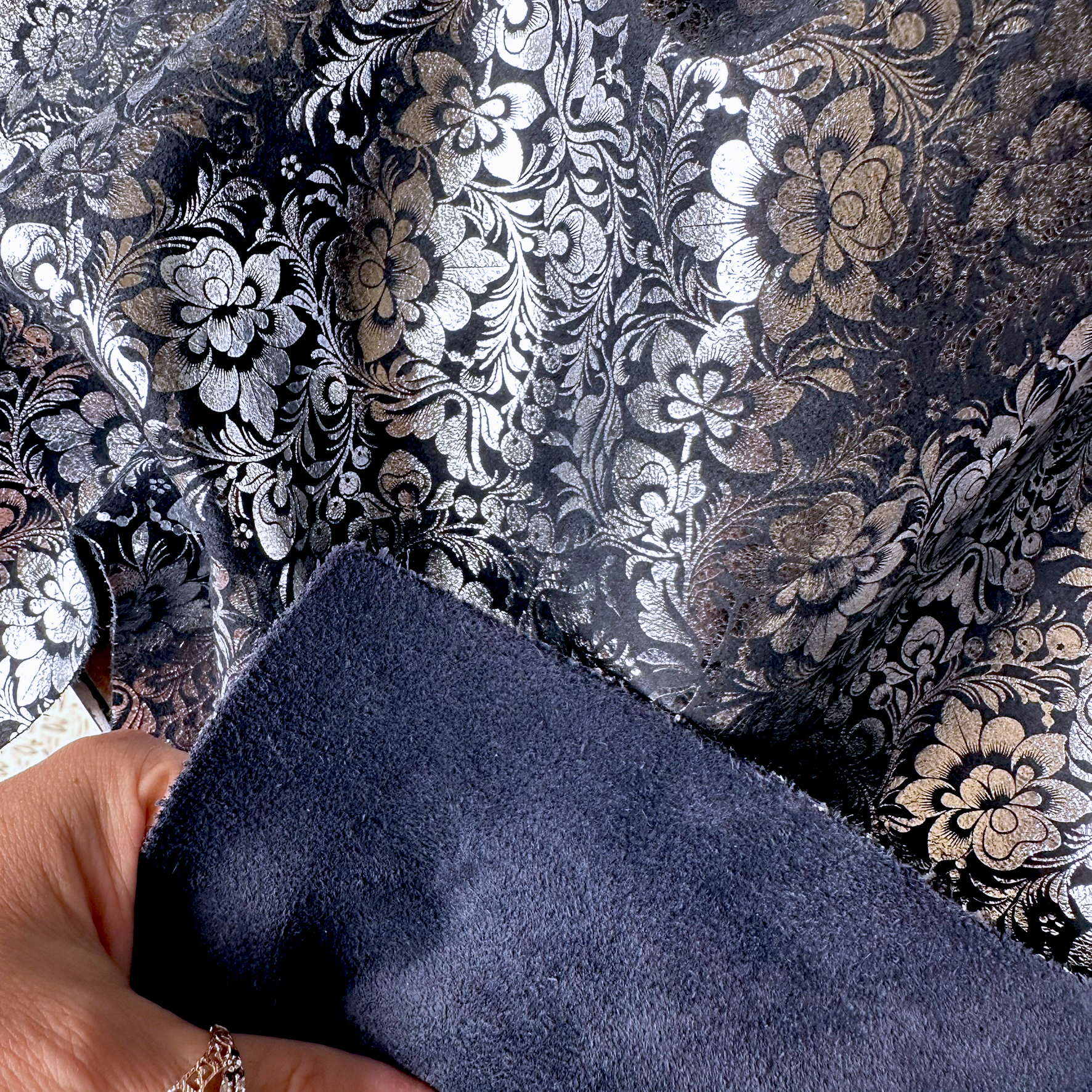 Dieses Rindleder besticht durch seine samtige Velours-Oberfläche in einem dunklen Blauton, die mit einer silbernen Metallic-Folierung in einem schönen Blumendesign veredelt ist. Der dezente Glanz auf der weichen Struktur verleiht dem Material einen edlen Touch – perfekt für moderne und stilvolle Accessoires mit hochwertigem Charakter.