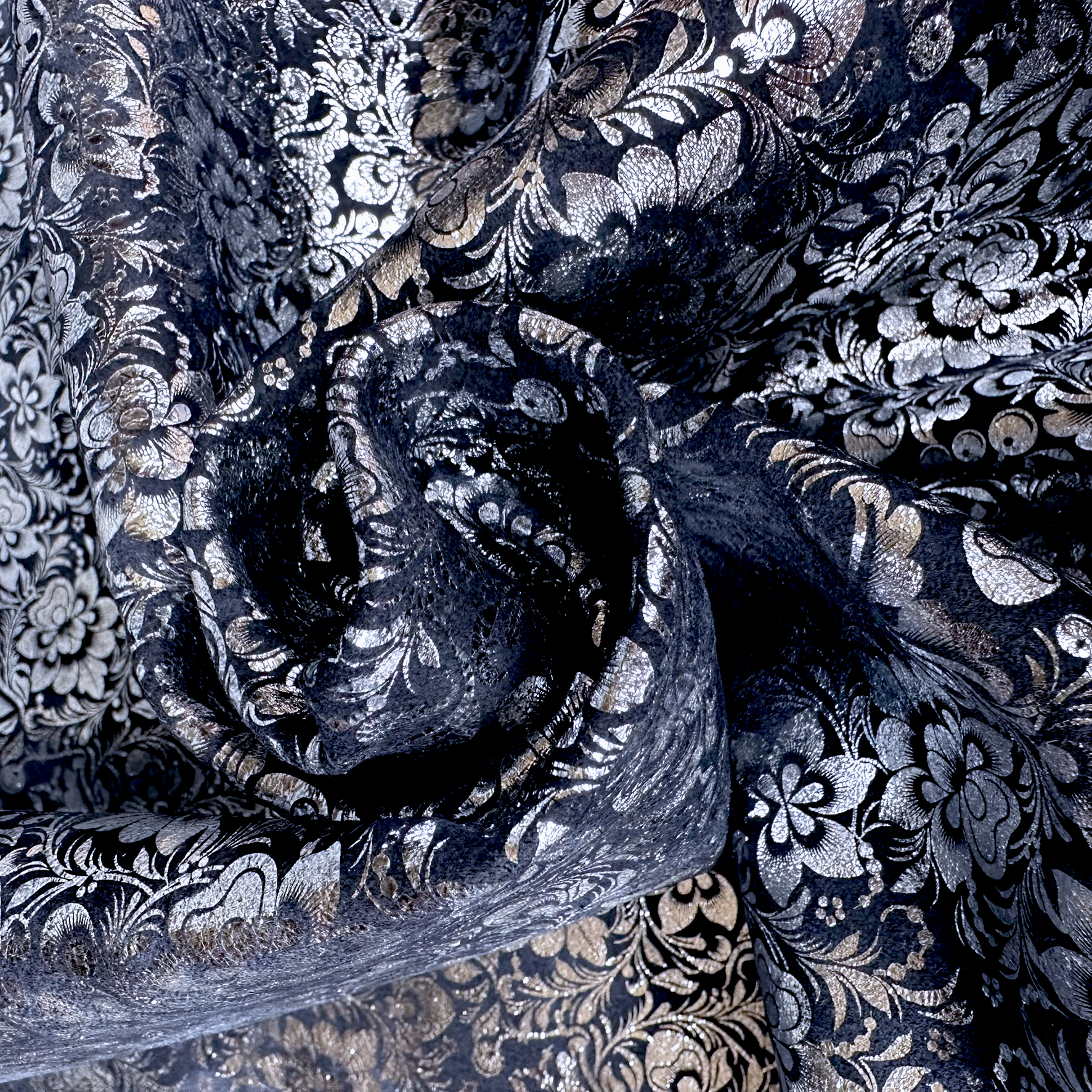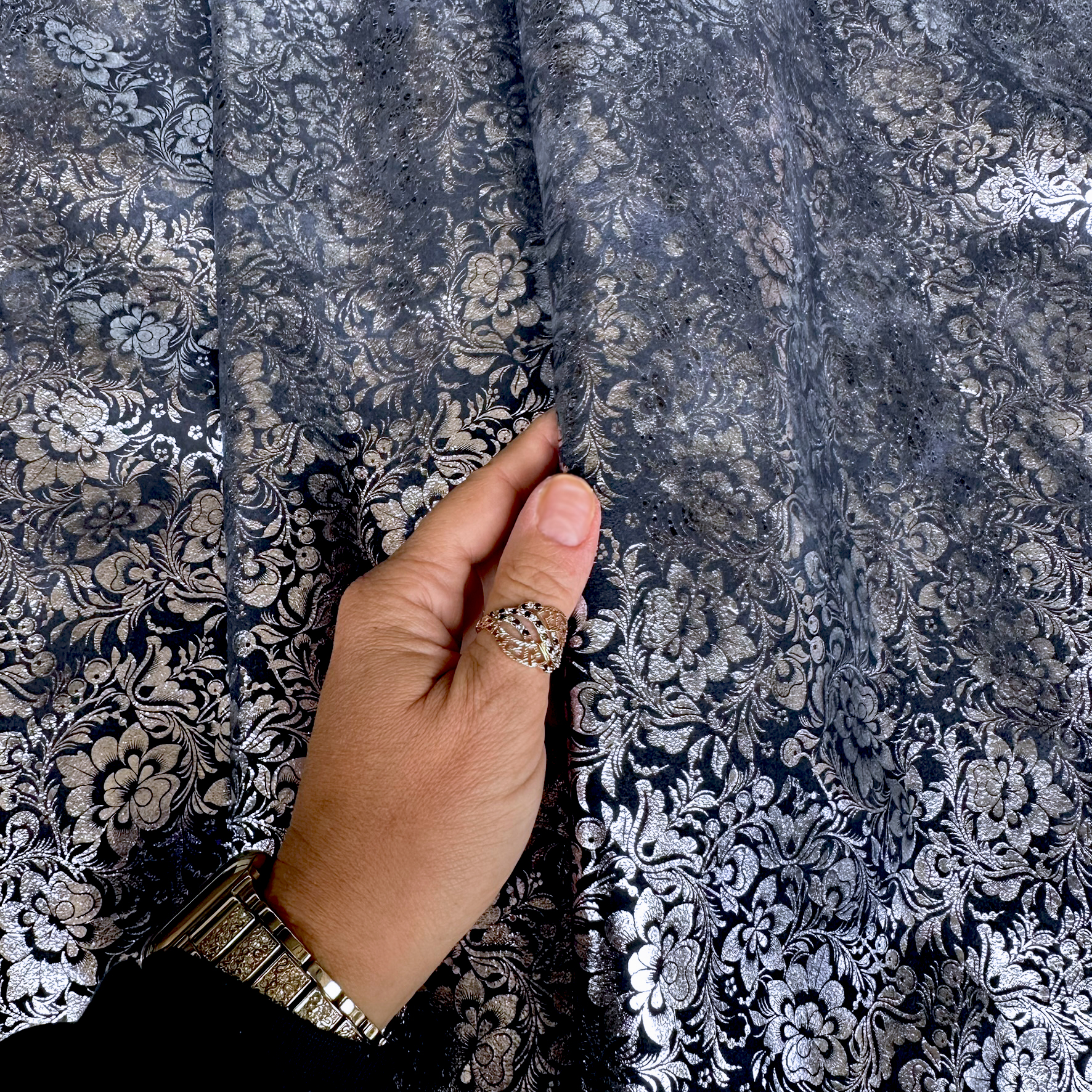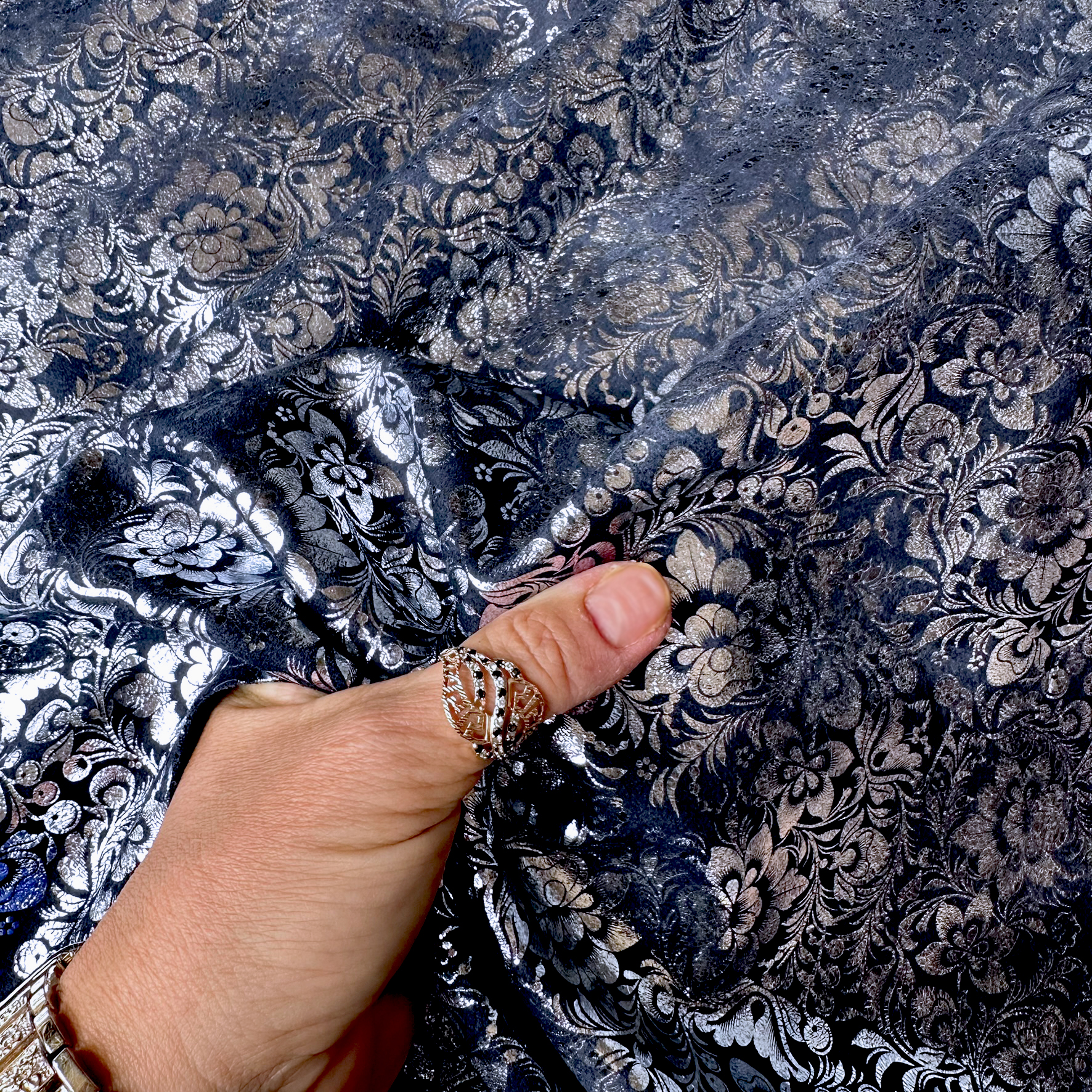 Dieses Rindleder besticht durch seine samtige Velours-Oberfläche in einem dunklen Blauton, die mit einer silbernen Metallic-Folierung in einem schönen Blumendesign veredelt ist. Der dezente Glanz auf der weichen Struktur verleiht dem Material einen edlen Touch – perfekt für moderne und stilvolle Accessoires mit hochwertigem Charakter.