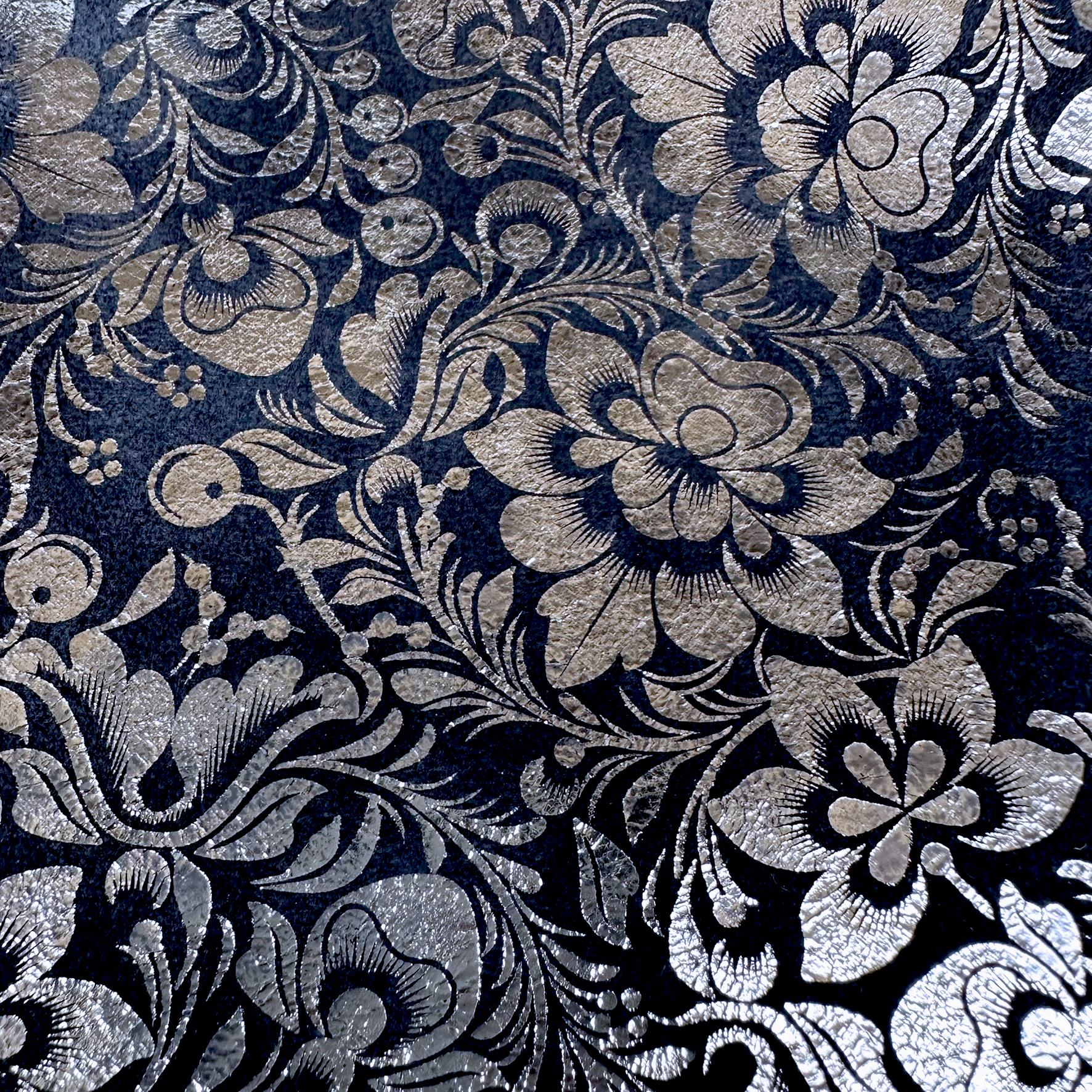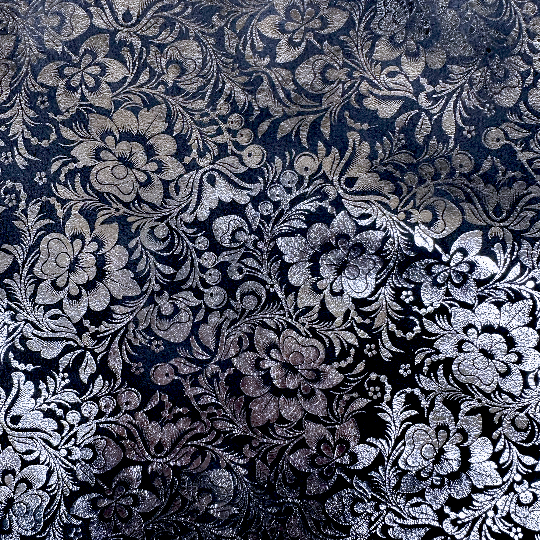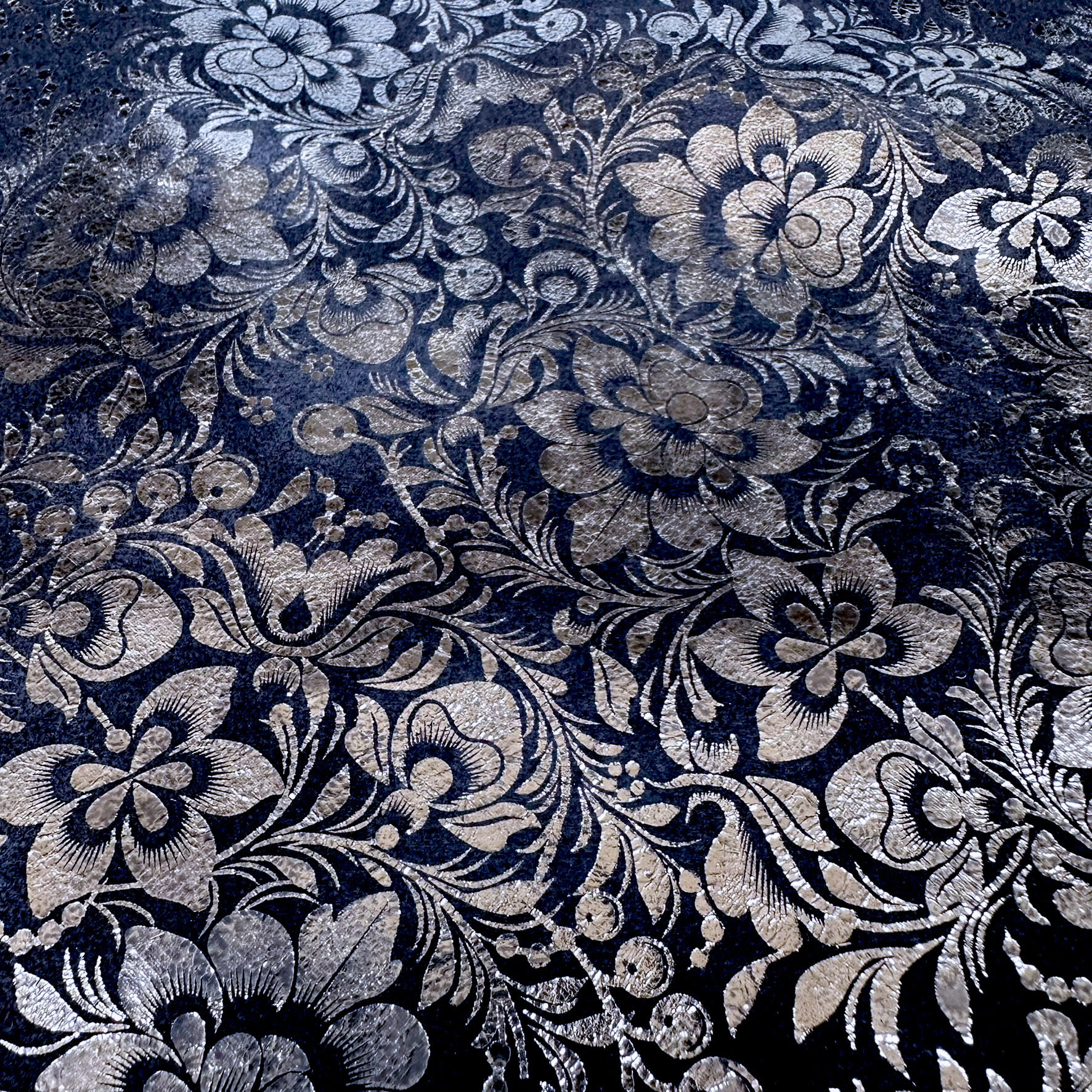 Produktinformationen "Schuh- & Taschenleder „Blumen mit Silberglanz auf Dunkelblau“ – Rindleder mit Metallic-Folierung"