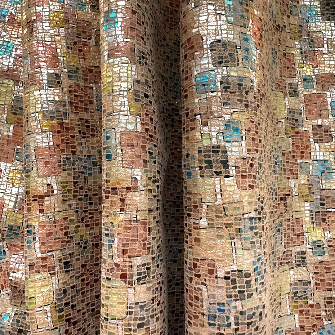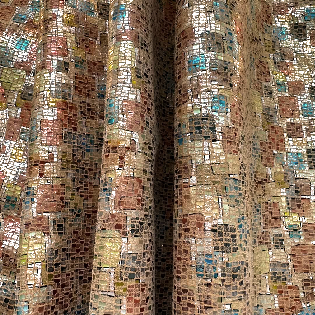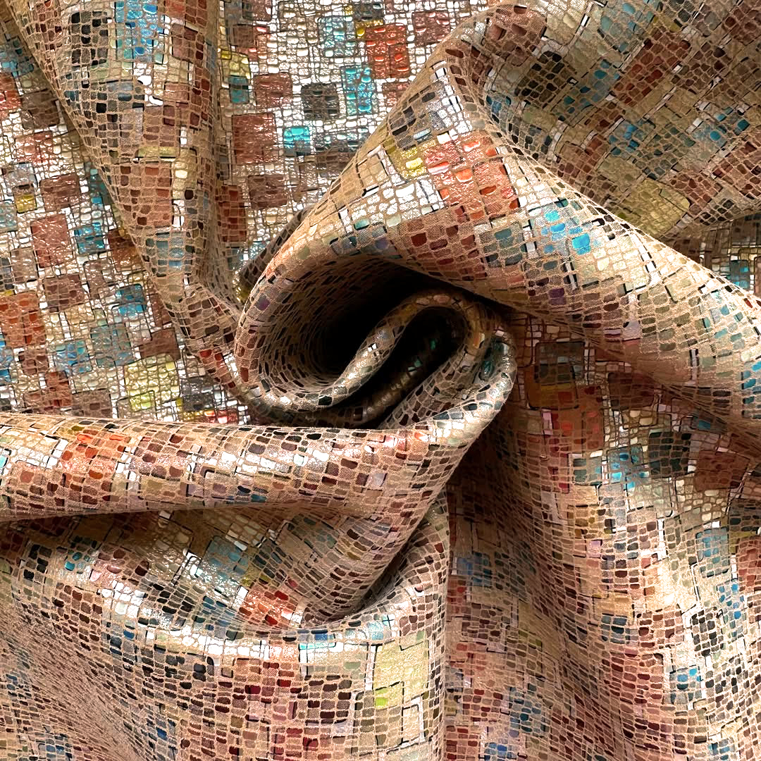 Dieses auffällige Lammleder kombiniert eine hellbraune Veloursbasis mit einer extravaganten Folienprägung in unterschiedlich großen Quadrate in verschiedenen Farben. Manche davon sind in Metallic. Der silbrige Glanz der Akzente sorgt für starke Kontraste und verleiht dem Leder eine außergewöhnlich moderne und zugleich edle Ausstrahlung – perfekt für stilvolle Accessoires mit Statement-Charakter.