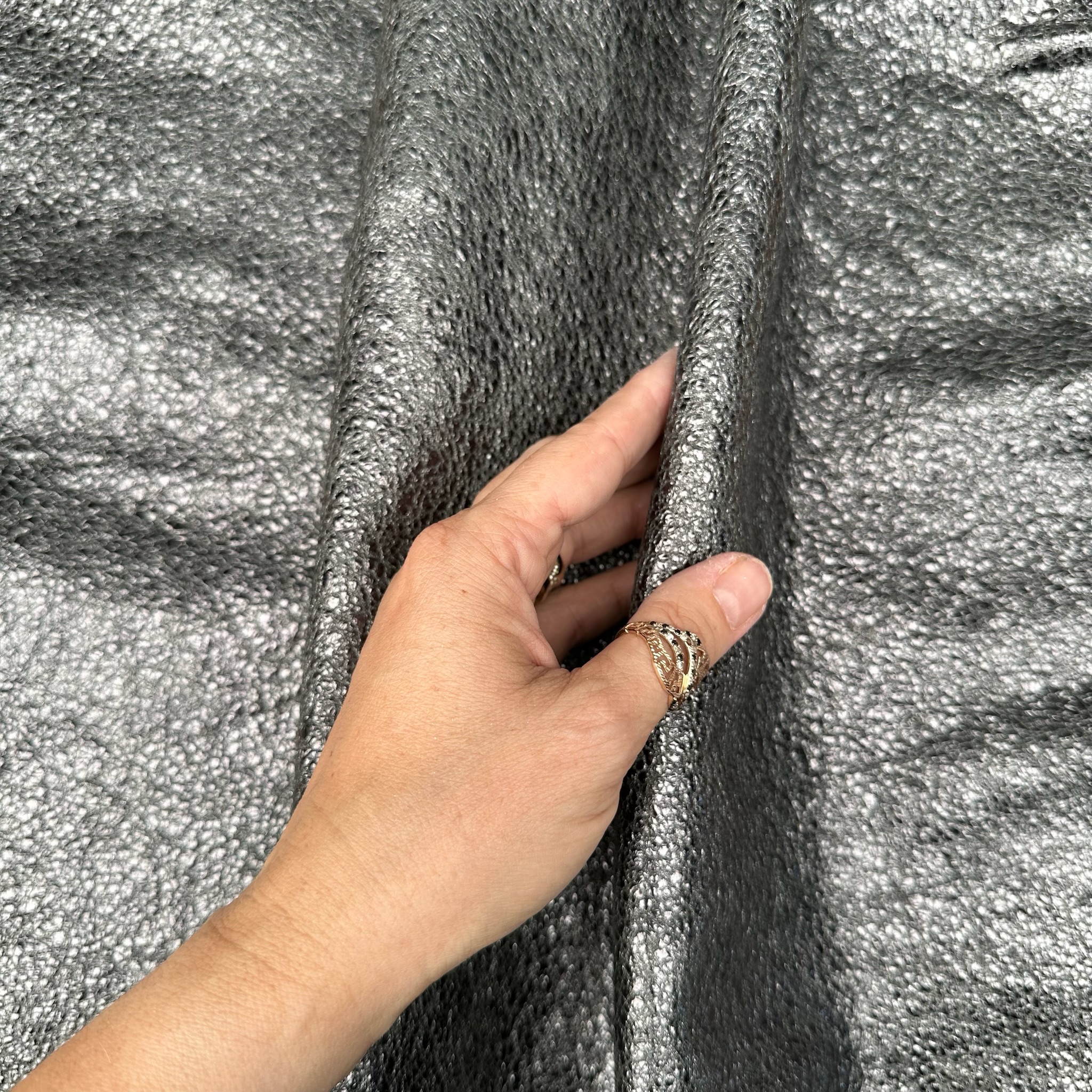 Dieses edle Echtleder überzeugt durch eine zarte Craquelé-Struktur in Kombination mit einer metallischen Folienbeschichtung. Die Oberfläche des Leder erinnert an das Schrumpfleder, es ist aber kein Schrumpfleder. Das Leder hat einen auffälligen ungewönlichen Look. Ein echter Hingucker für stilvolle Taschen und moderne Accessoires.