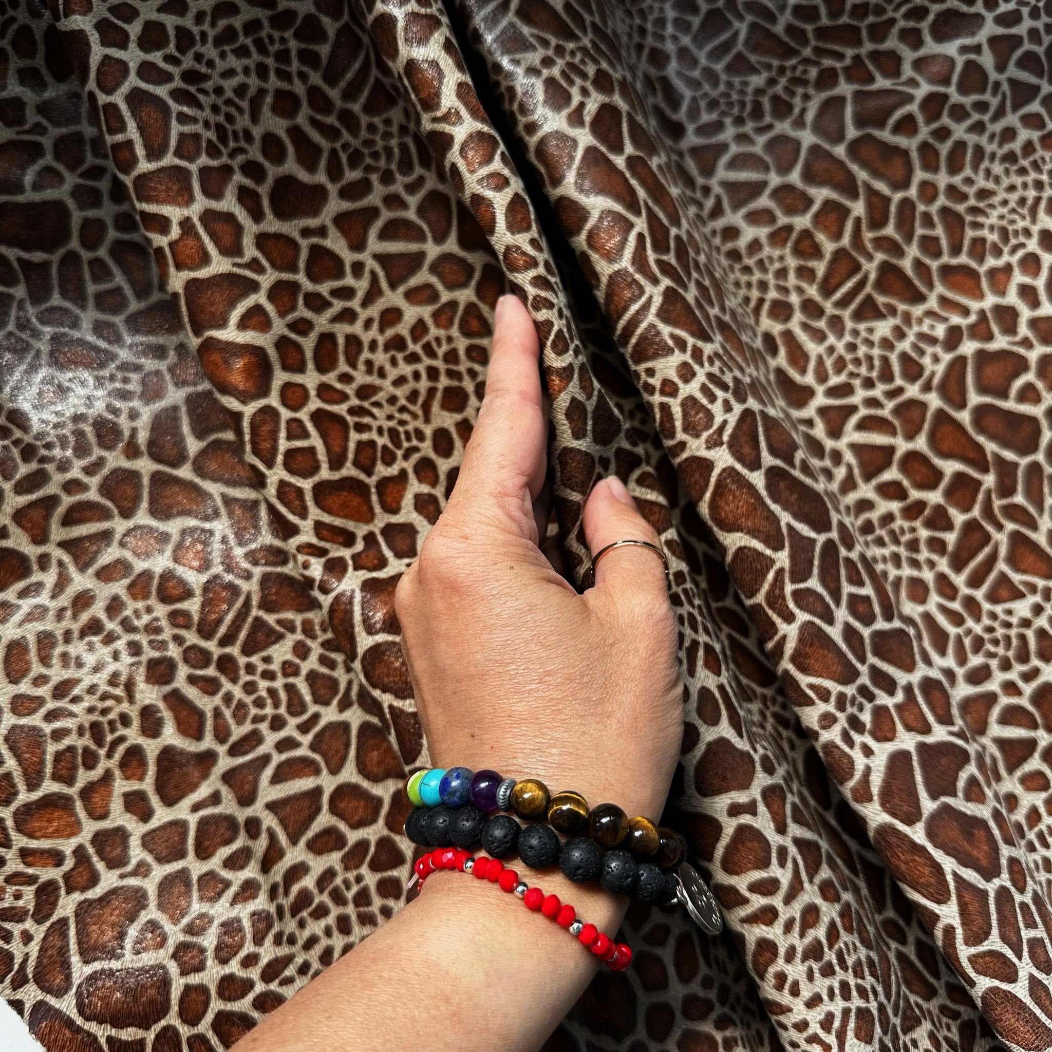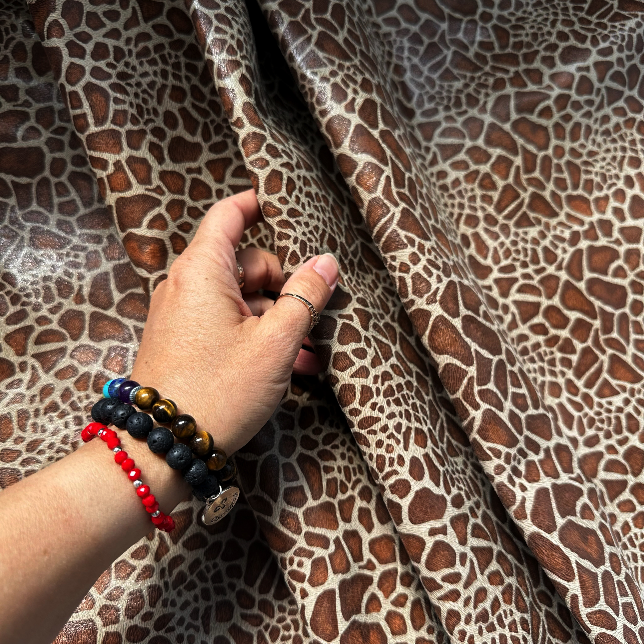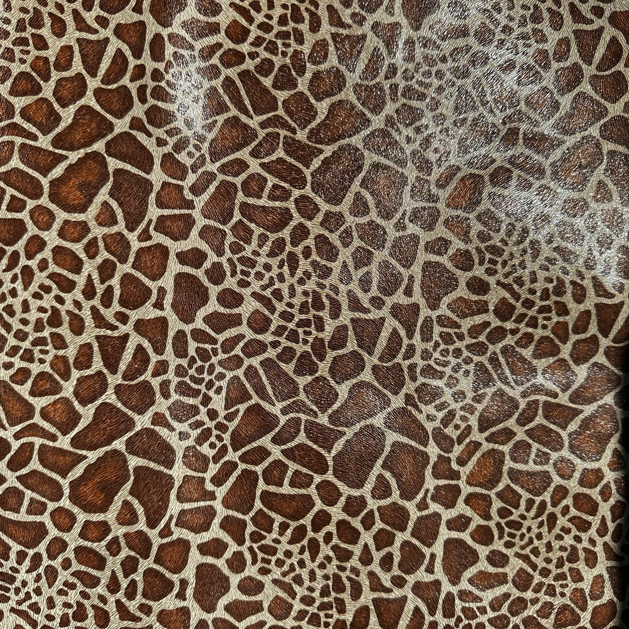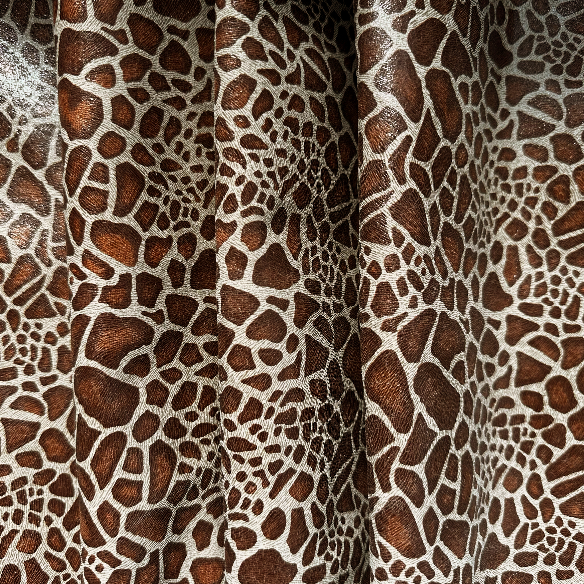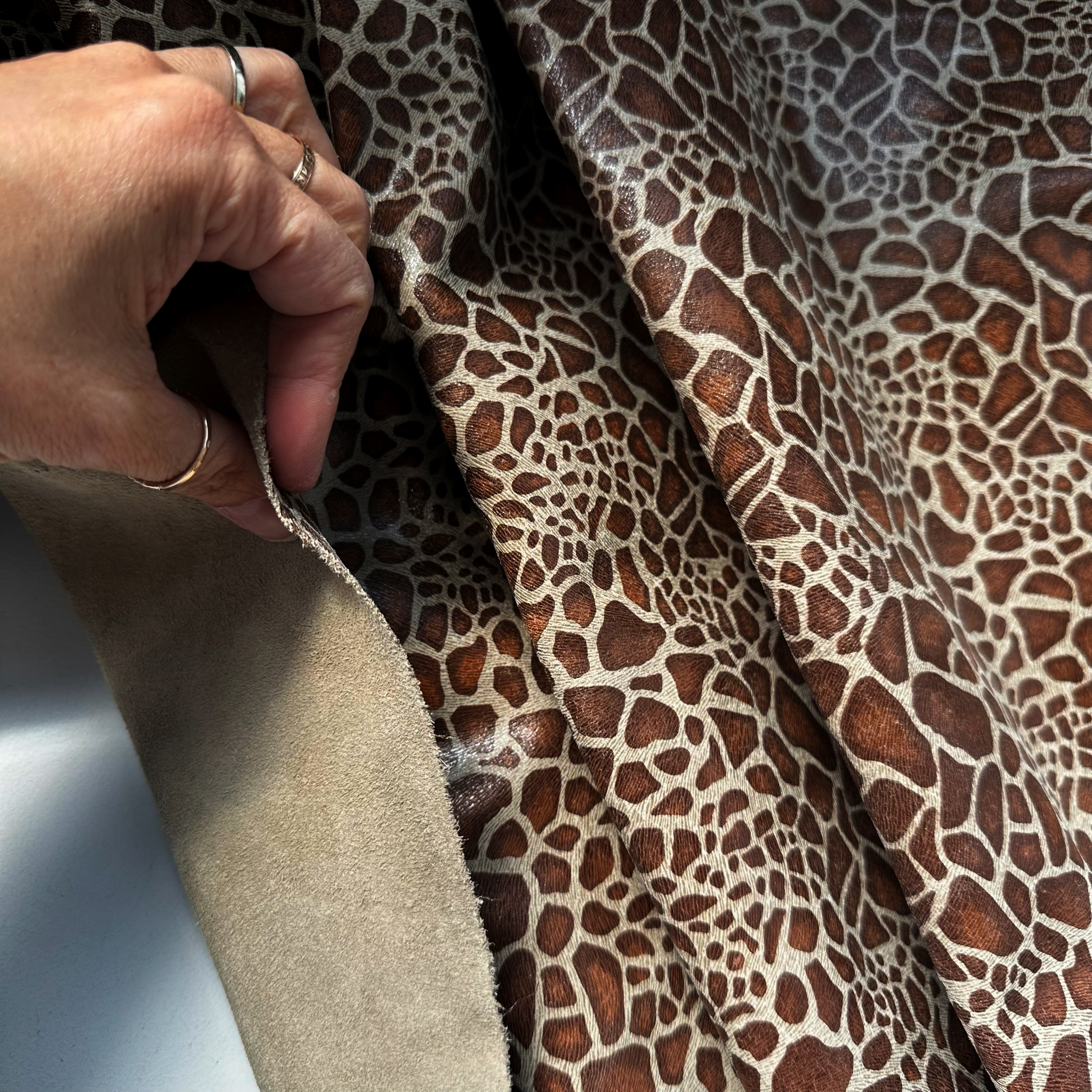 Dieses charaktervolle Rindleder beeindruckt mit einer markanten Giraffepmusterung in schönen Brauntönen und einer vorgeprägten Fellstruktur. Die leicht angedeutete 3D Struktur erzeugt eine luxuriöse, exotische Optik – ideal für anspruchsvolle Lederarbeiten mit einem Hauch Extravaganz.