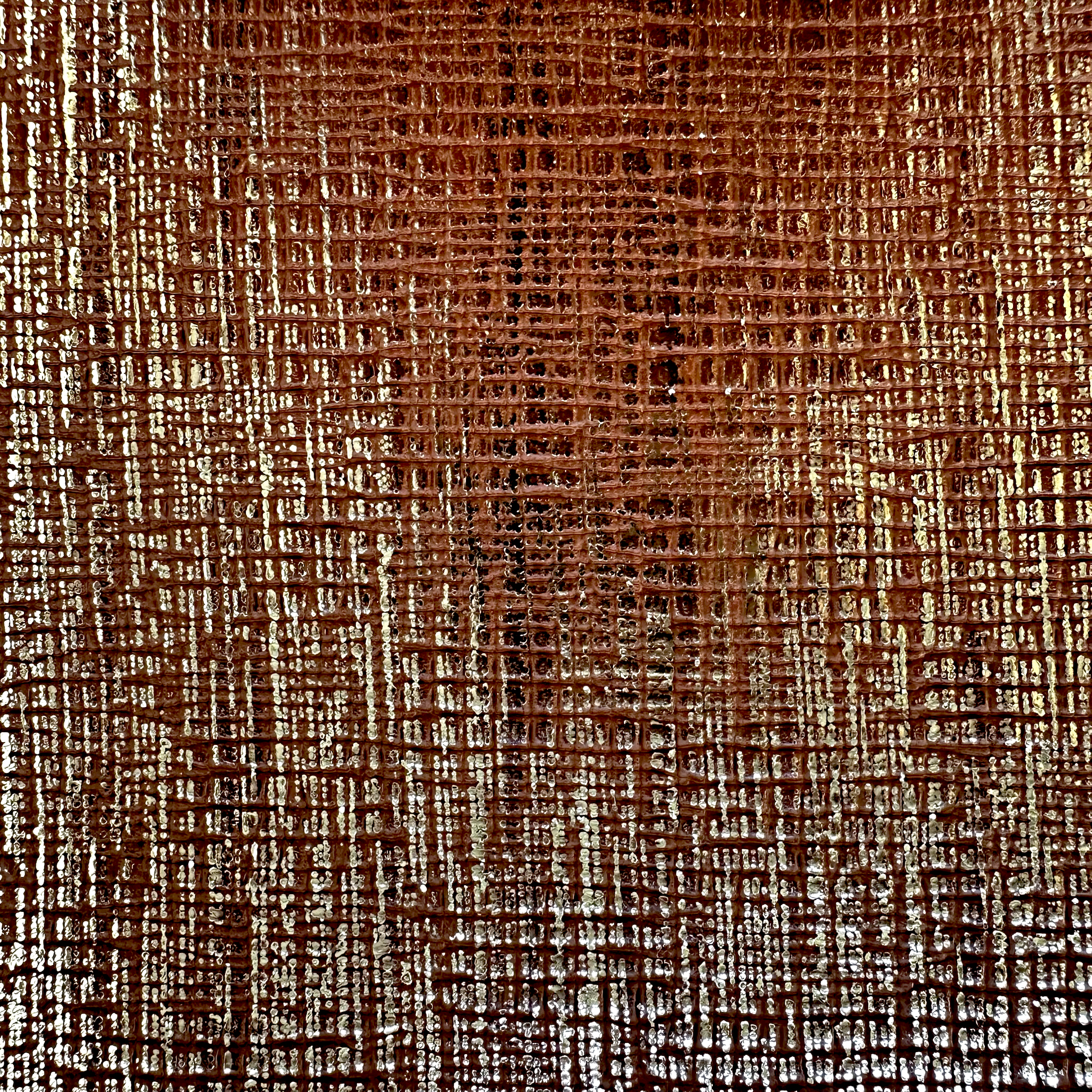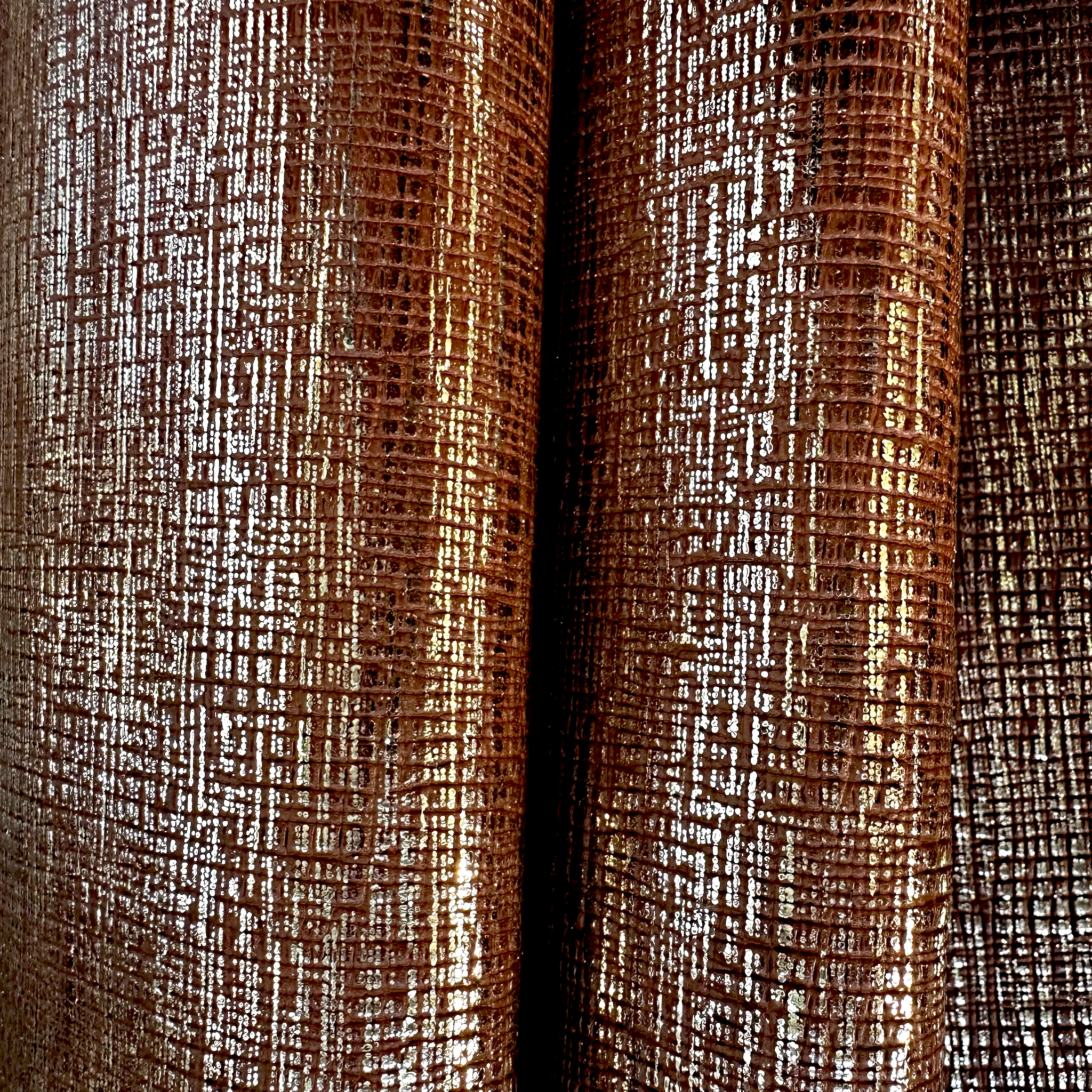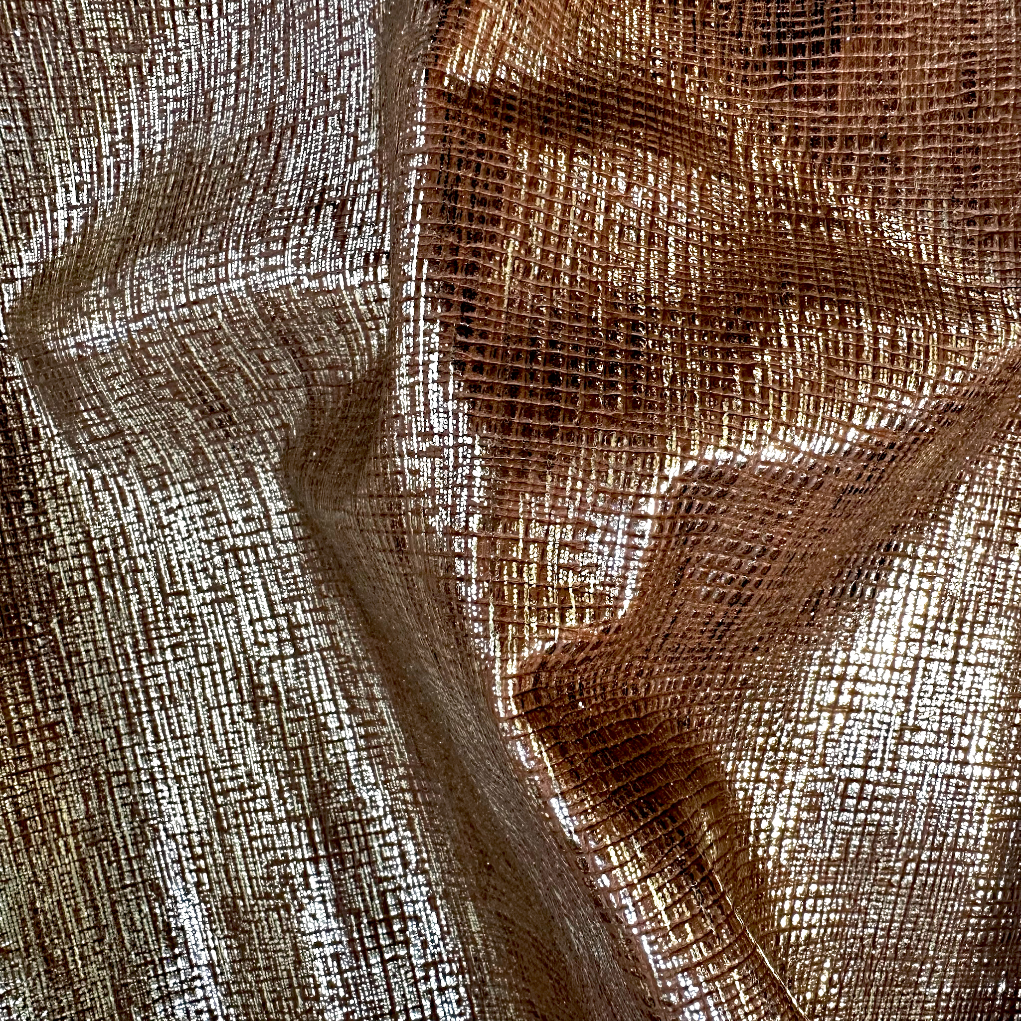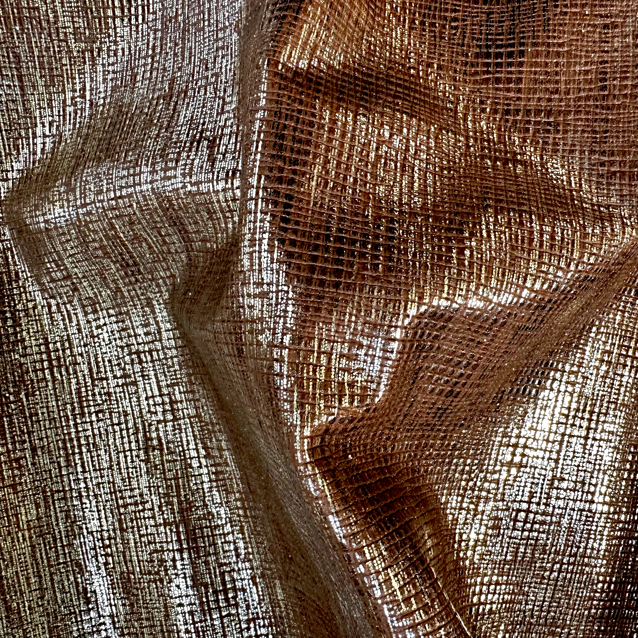 Dieses besondere Lammleder kombiniert eine moderne 3D-Karoprägung mit einer silber-metallischen Folierung auf cognacfarbenem Grund. Die unregelmäßig verlaufende Struktur erzeugt ein spannendes Lichtspiel – je nach Blickwinkel changiert die Oberfläche zwischen dezent und auffällig. Ideal für Projekte, die klare Linien mit edlem Glanz vereinen.