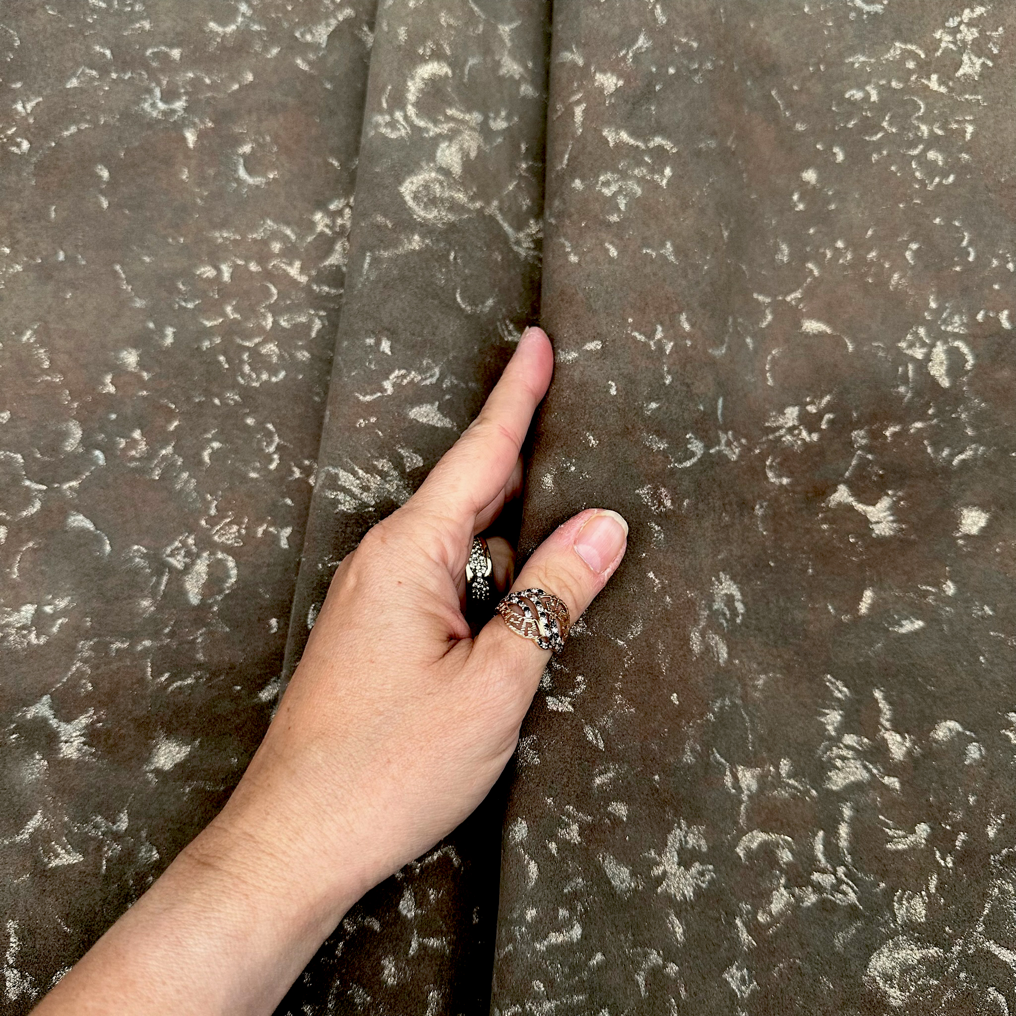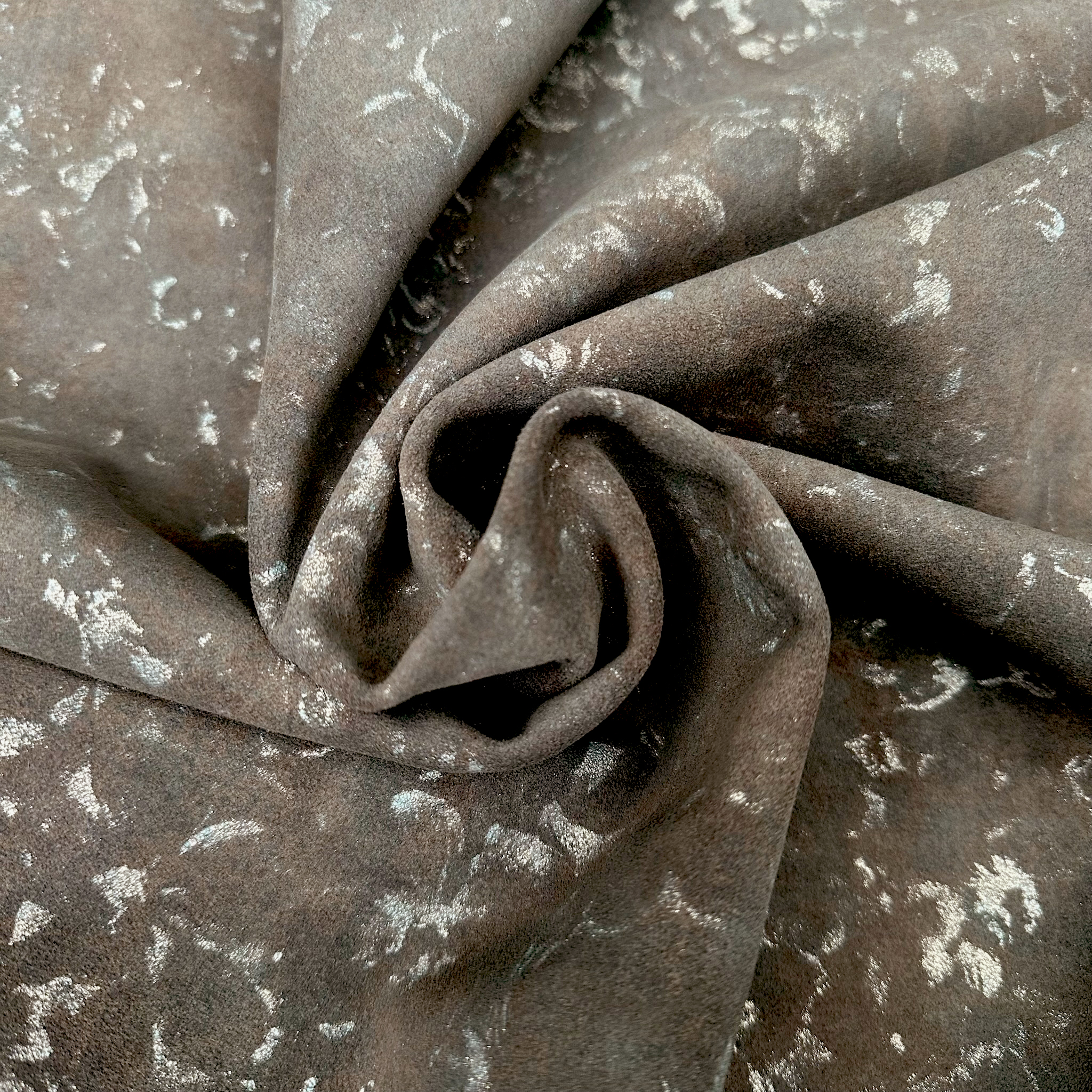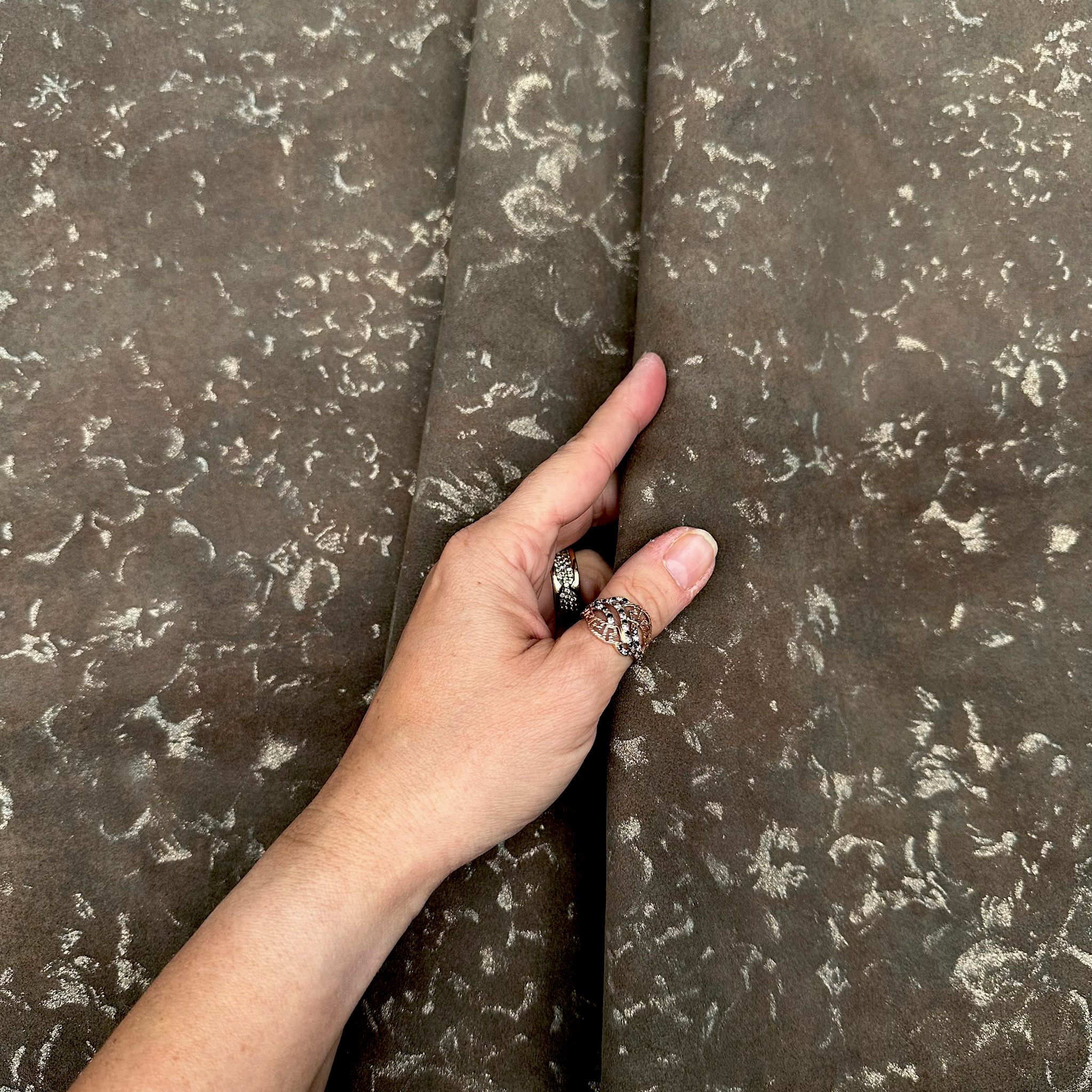 Dieses außergewöhnliche Veloursleder besticht durch ein leicht abstraktes Blütenmuster, das durch filigrane Heißprägung auf der Oberfläche entsteht. Abgerundet wird das Design durch eine unregelmäßige Glitterveredelung. Die leichte Marmorierung verleiht dem Leder eine faszinierende Tiefe – ein einzigartiger Blickfang für extravagante Taschen und stilvolle Schuhdesigns.