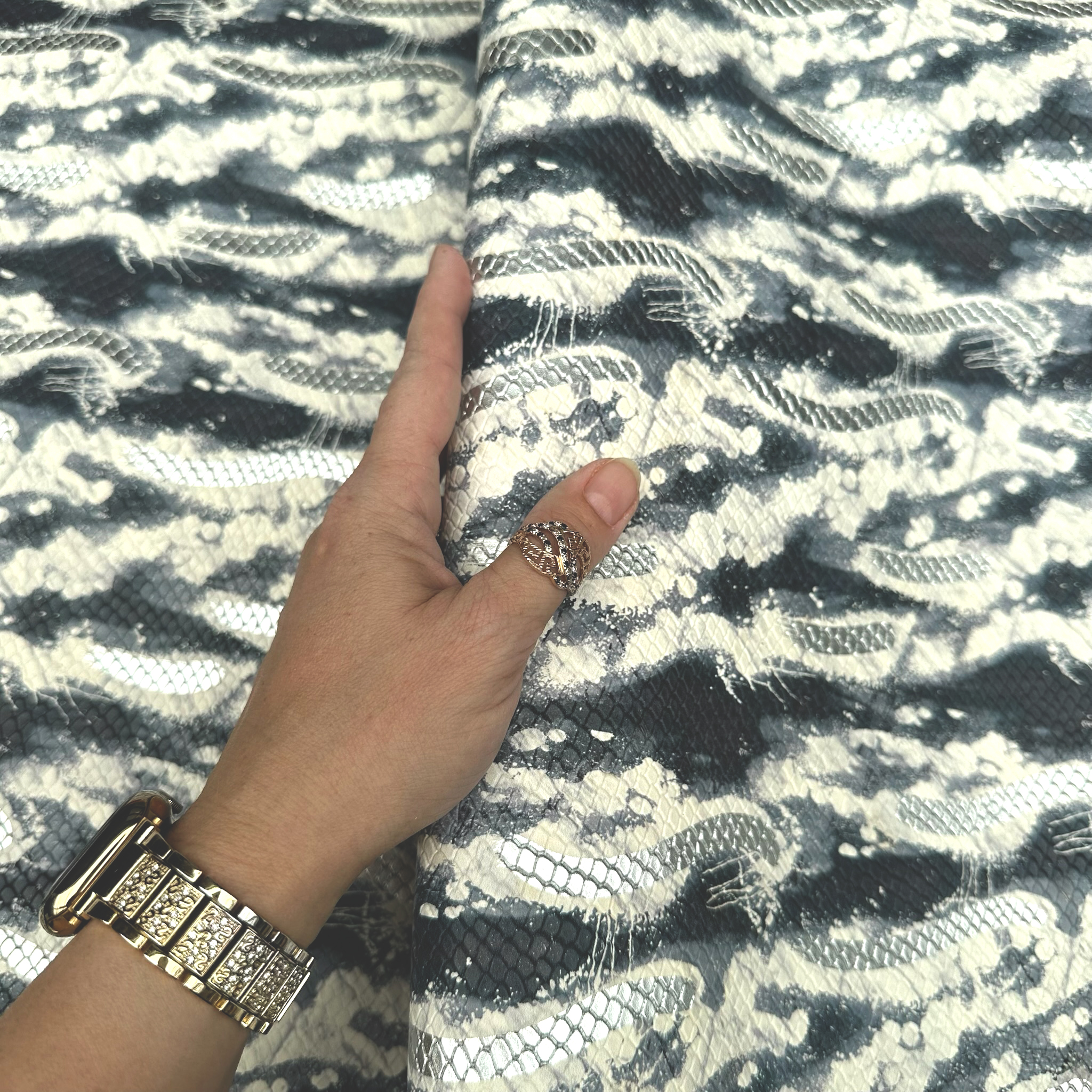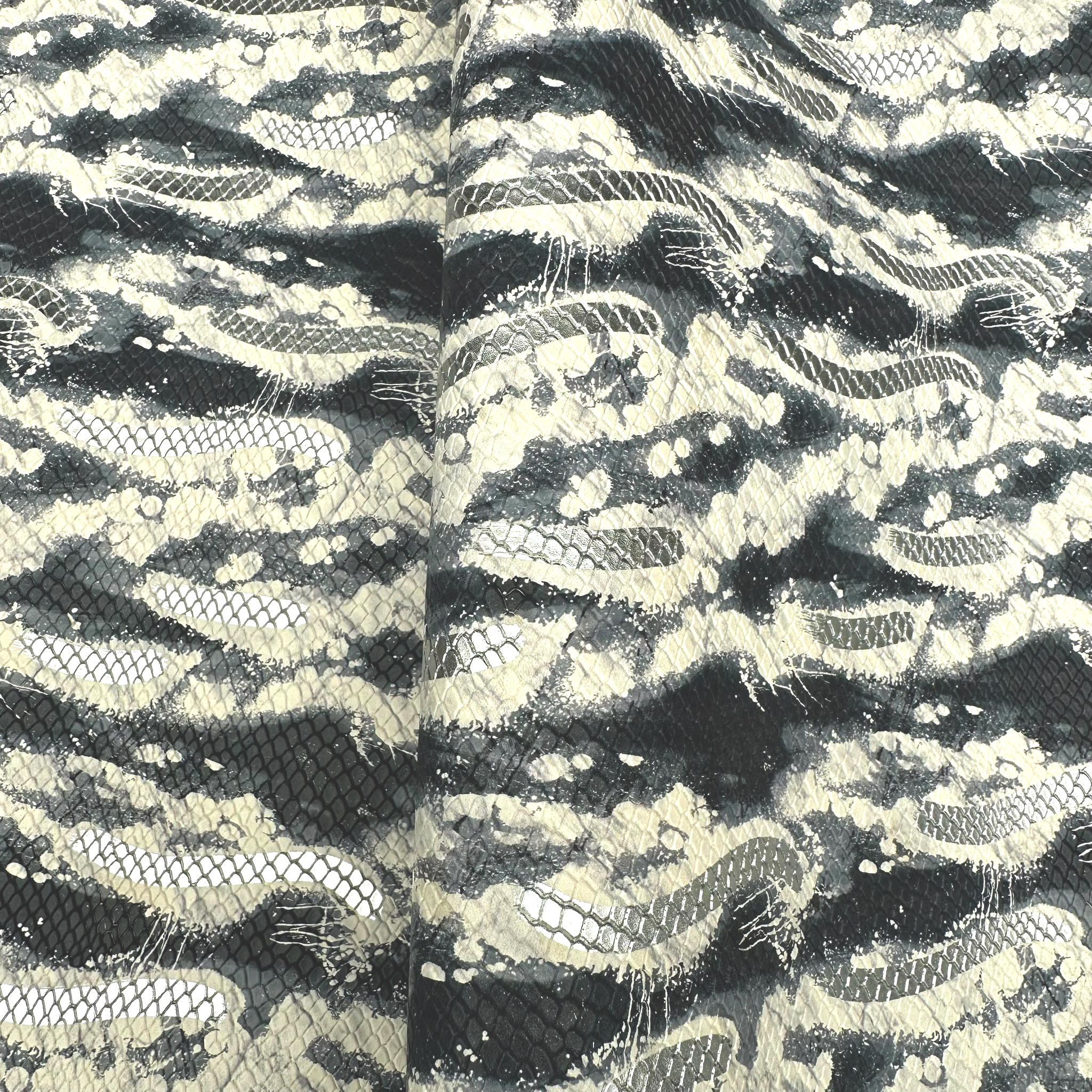Schuh- & Taschenleder „Multicolor Metallic Abstraktion in Grau“ – Rindleder mit 3D Schlangenprägung & Silbermetallic Folie