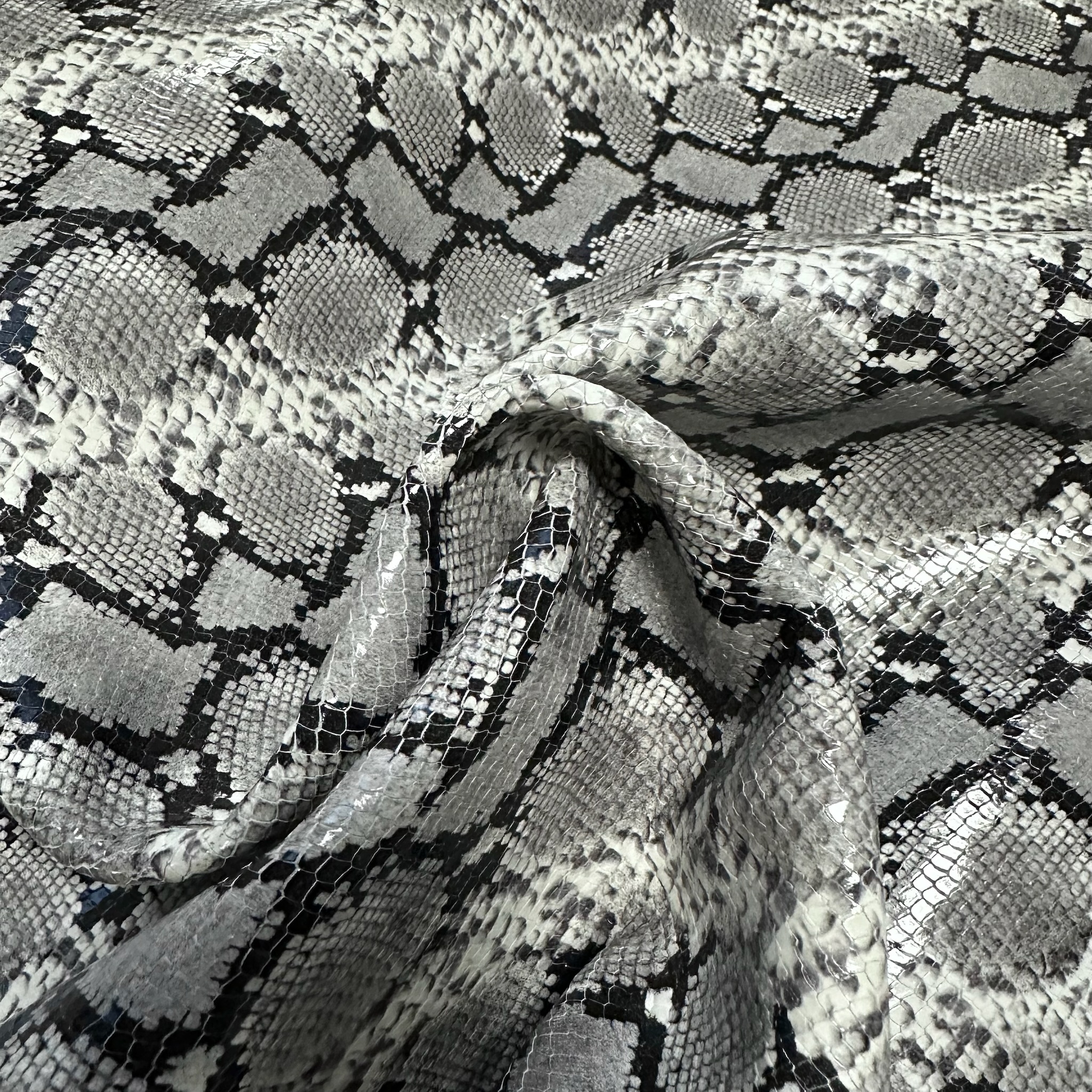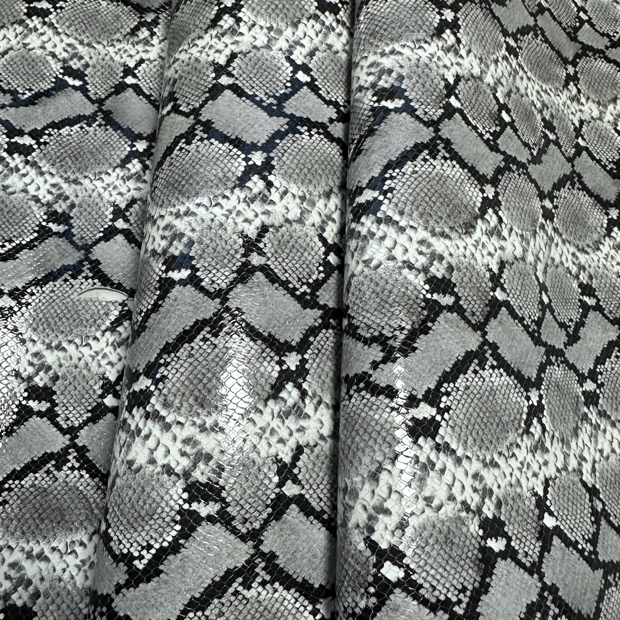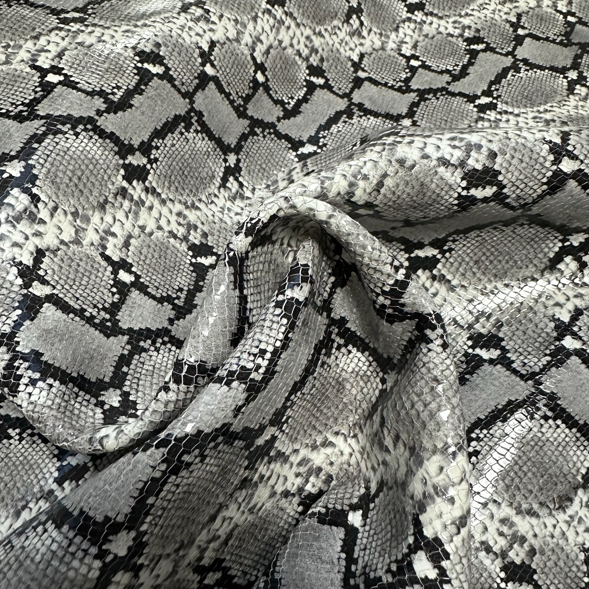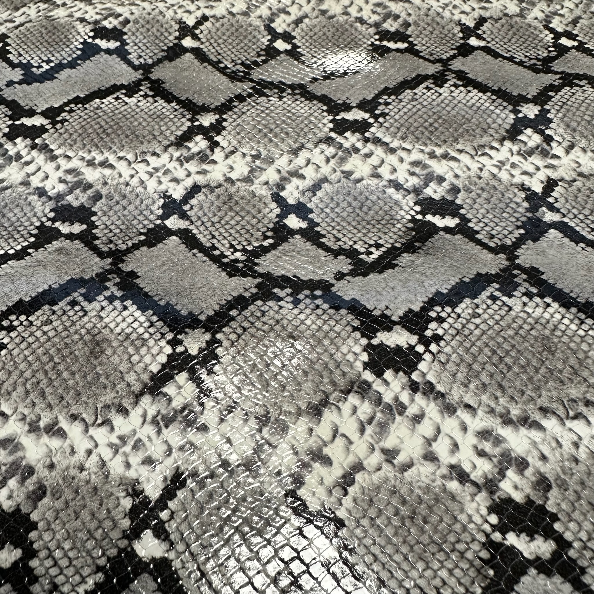 Dieses formstabile Leder besticht durch eine detailreiche 3D-Prägung im Schlangenmuster, kombiniert mit einem marmorierten Farbverlauf in zartem Hellgrau. Der glänzende Finish bringt Tiefe und Bewegung ins Design, während die stabile Struktur das Leder ideal für formgebende Anwendungen macht – von Statement-Taschen bis hin zu edlen Interior-Akzenten.