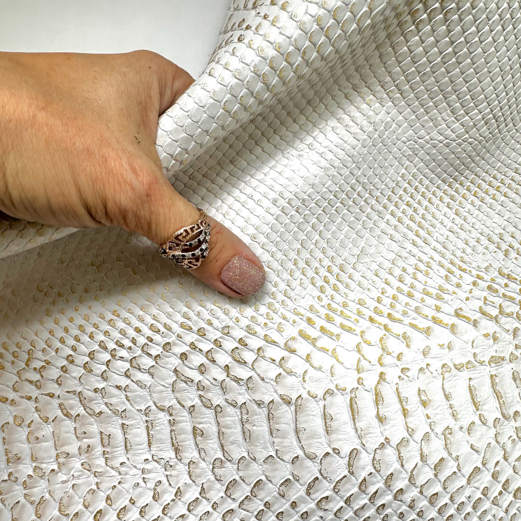 Produktinformationen "Schuh- & Taschenleder „Python Weiß mit Goldakzenten“ – Rindleder mit 3D-Reptilprägung & Metallic-Finish "