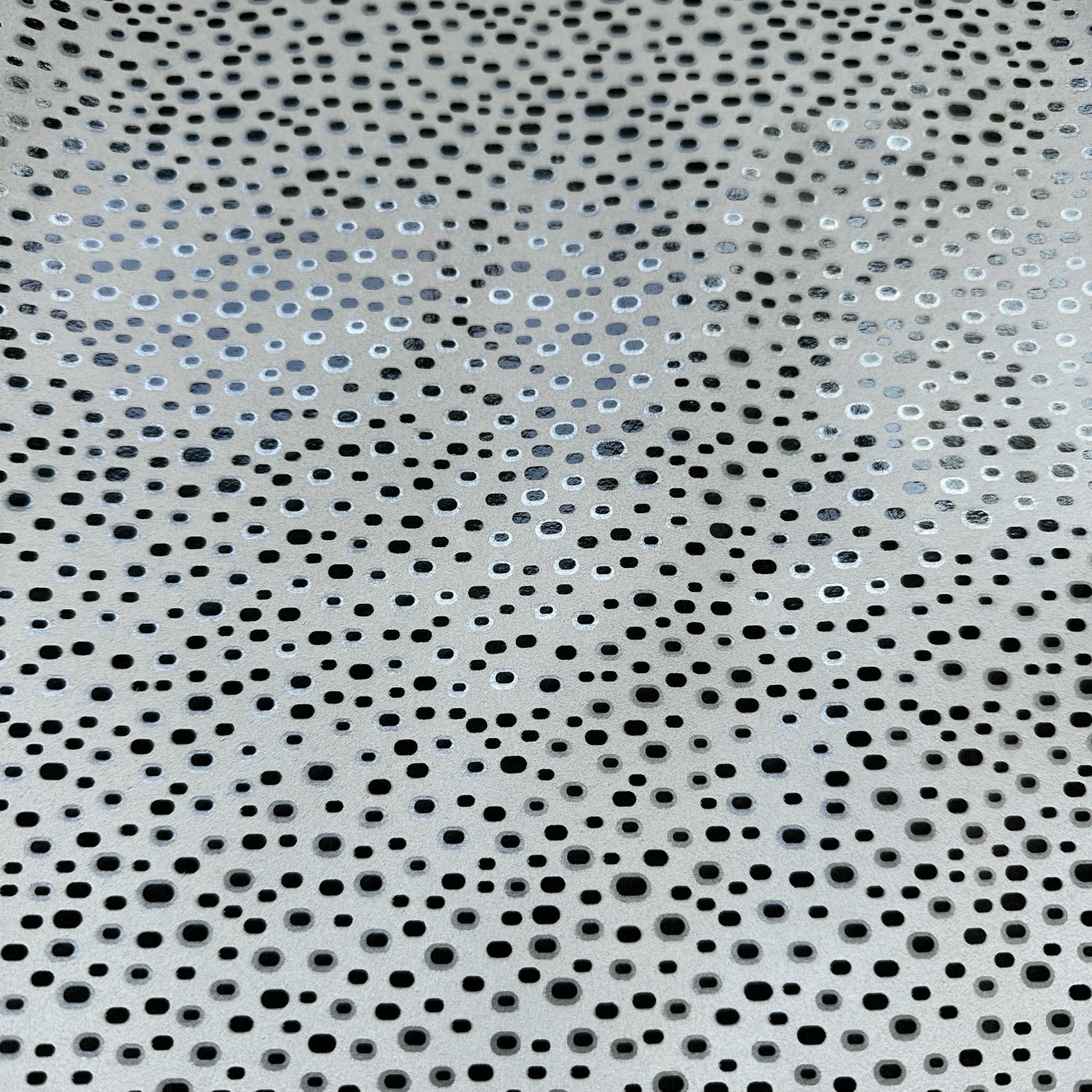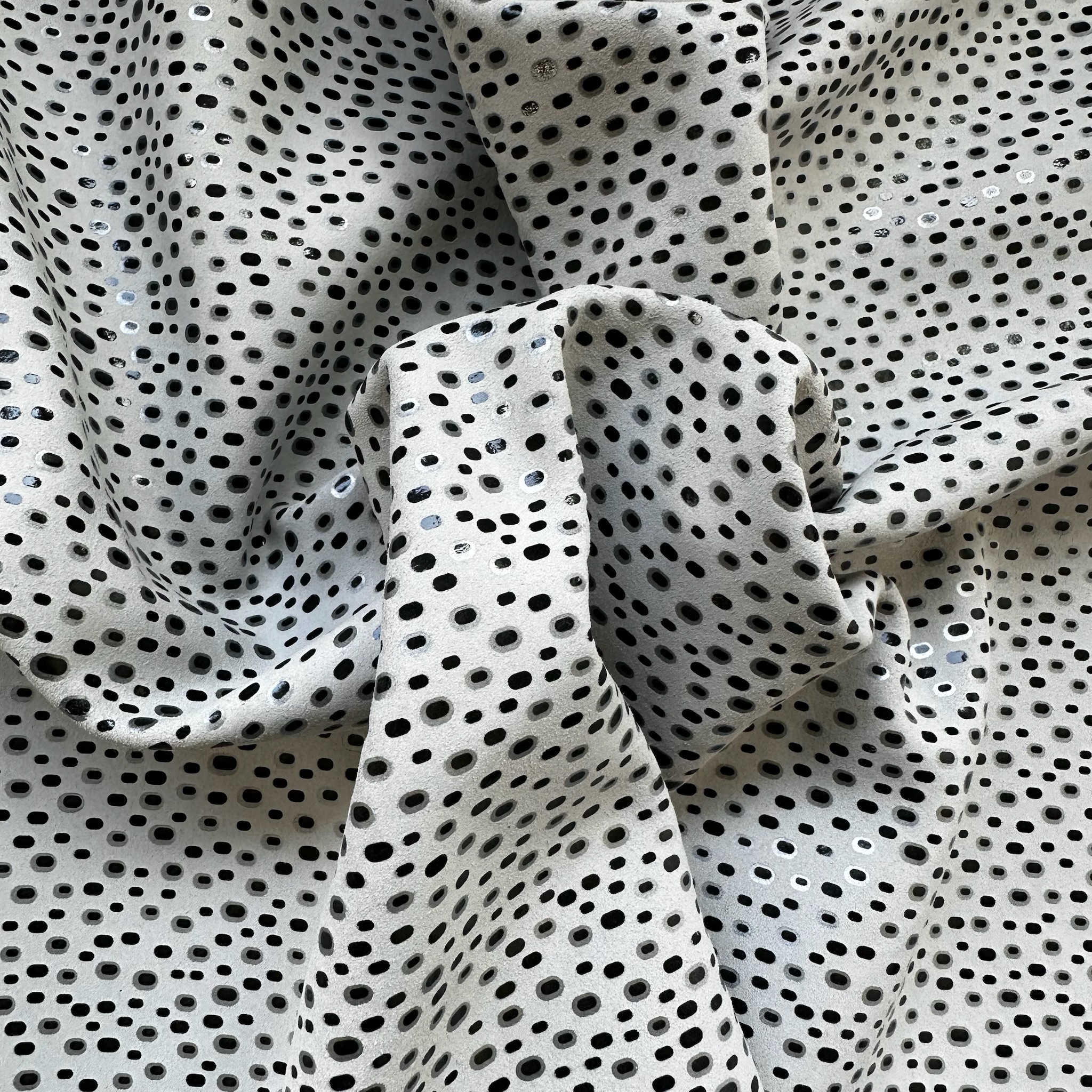 Dieses auffällige Lammleder kombiniert eine helle fast weiße Veloursbasis mit einer extravaganten Folienprägung in unregelmäßiger Punktestruktur in Schwarz und Silber-Metallic. Der silbrige Glanz der Akzente sorgt für starke Kontraste und verleiht dem Leder eine außergewöhnlich moderne und zugleich edle Ausstrahlung – perfekt für stilvolle Accessoires mit Statement-Charakter.
