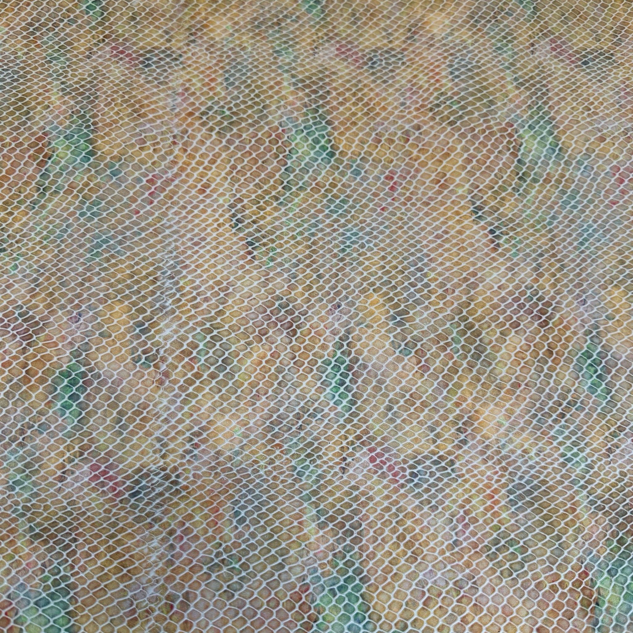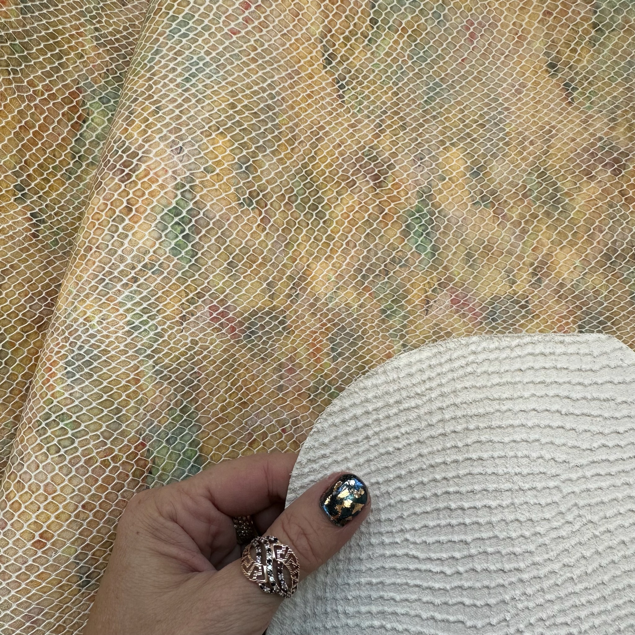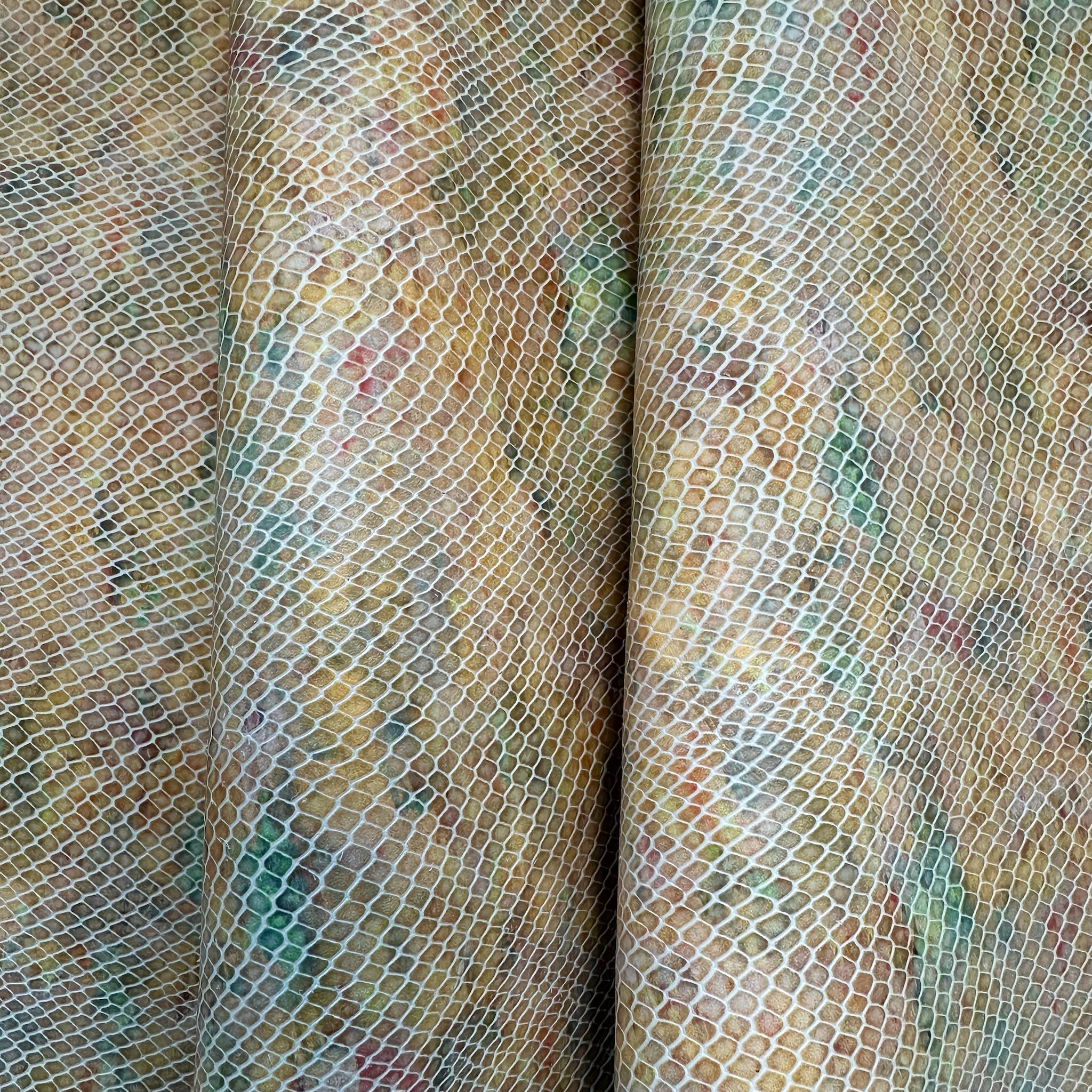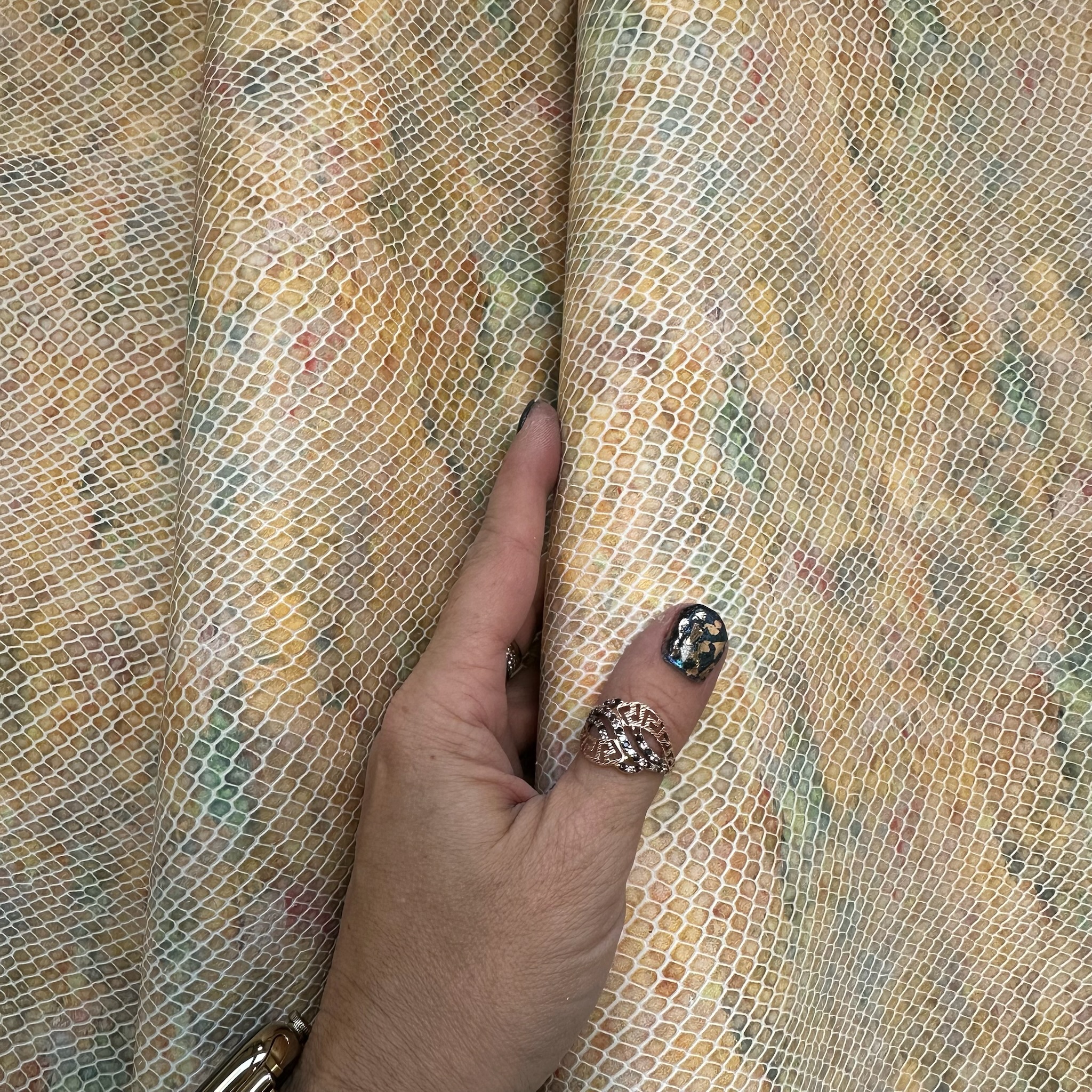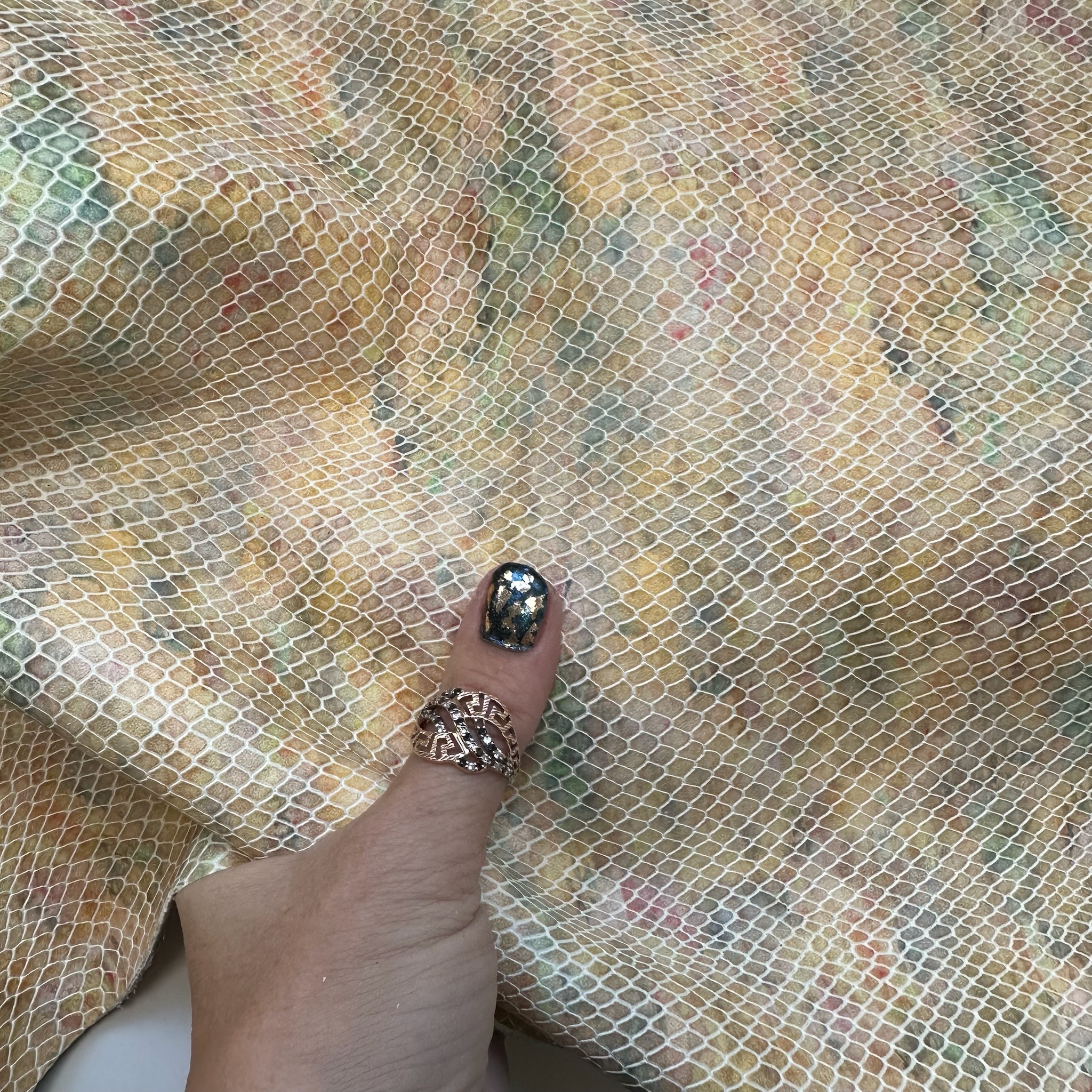Dieses feine Leder überzeugt durch eine detailreiche 3D-Schlangenprägung auf einem pastellfarbenen Untergrund. Die marmorierte Farbgebung in Gelb, Grün, Rosé und Beige wirkt wie mit Wasserfarben gemalt und bringt Leichtigkeit in das kraftvolle Reptilmuster. Die Kombination aus zarter Farbwelt und strukturierter Oberfläche verleiht dem Material eine elegante, künstlerische Ausstrahlung.
