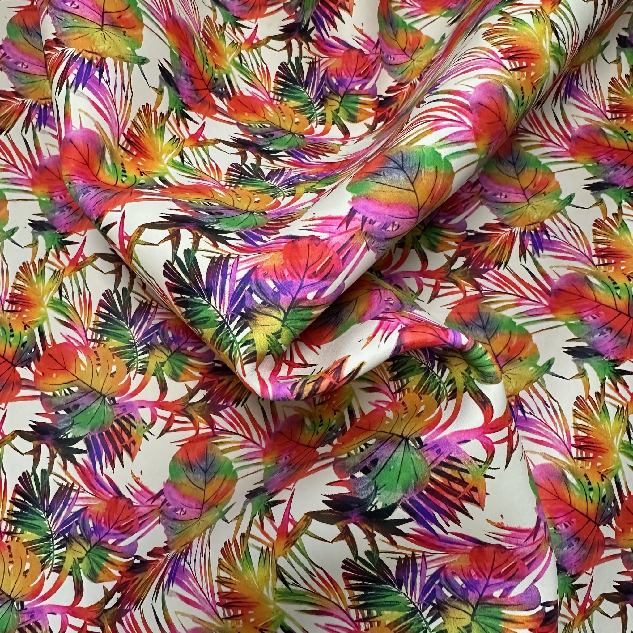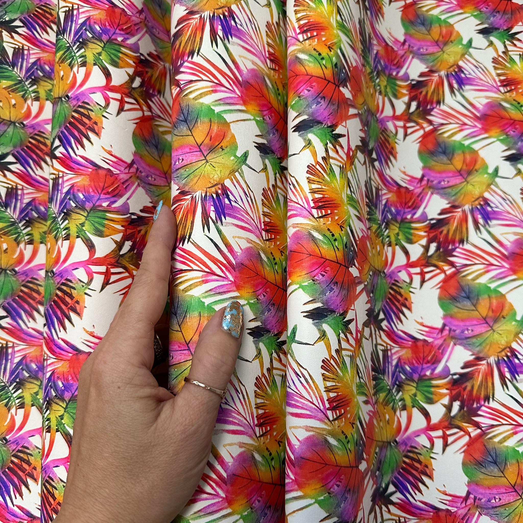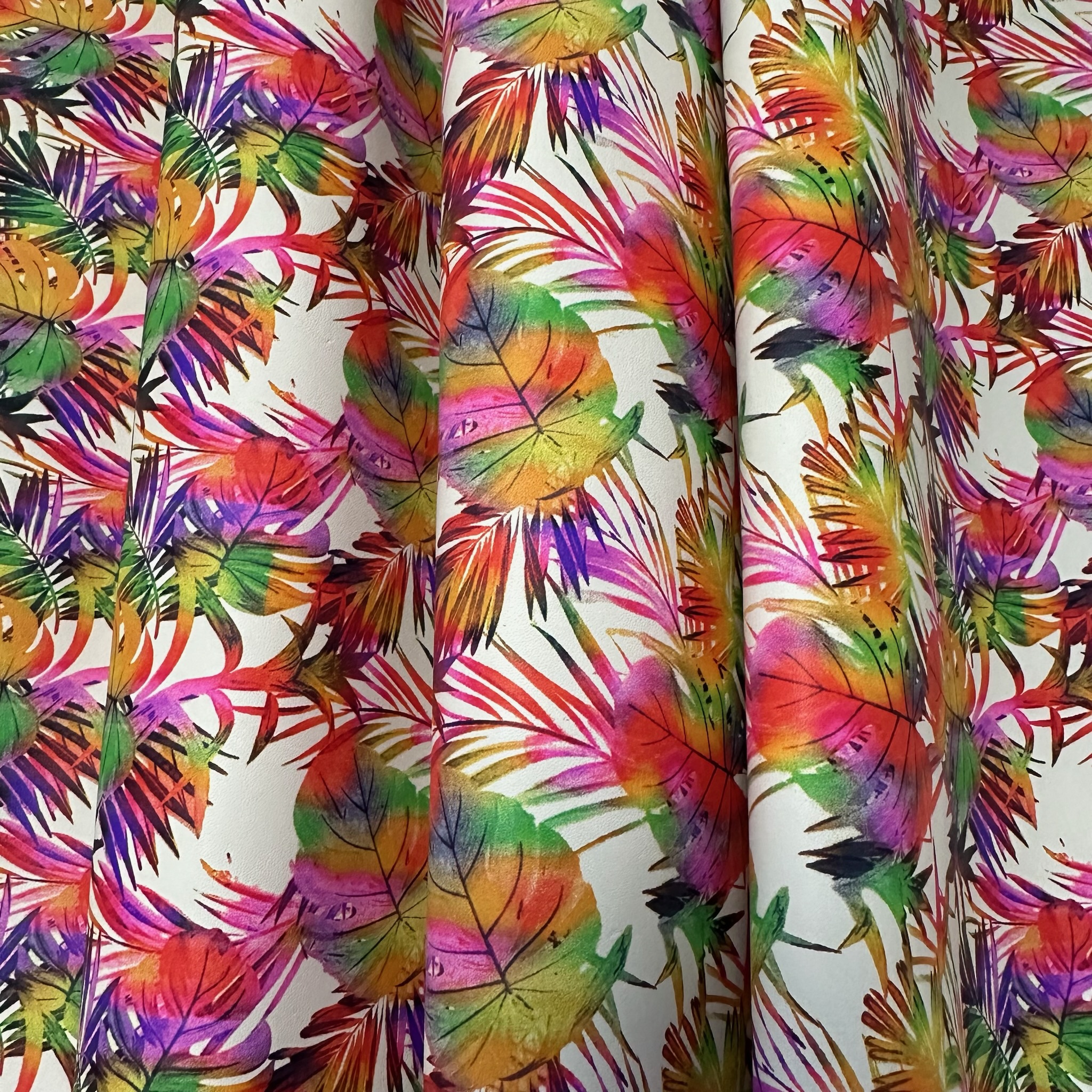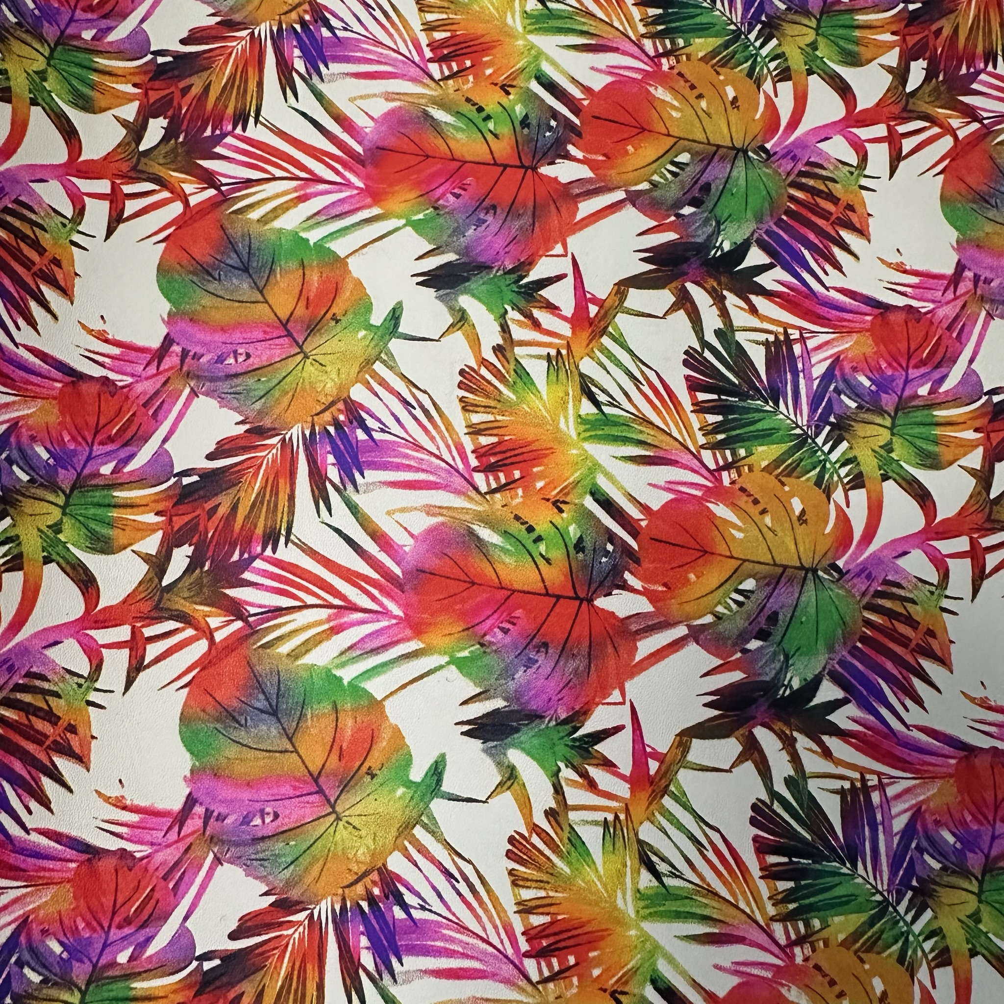 Dieses außergewöhnliche Rindleder bringt Farbe ins Spiel: Der lebhafte Print zeigt ein tropisches Blättermuster in Regenbogenfarben – von Pink und Orange über Grün, Lila bis hin zu Gelb und Schwarz – alles in aquarellartiger Ausführung auf hellem Grund. Das Leder ist stabil und gleichzeitig flexibel – ideal für fröhliche Accessoires mit tropischem Flair.