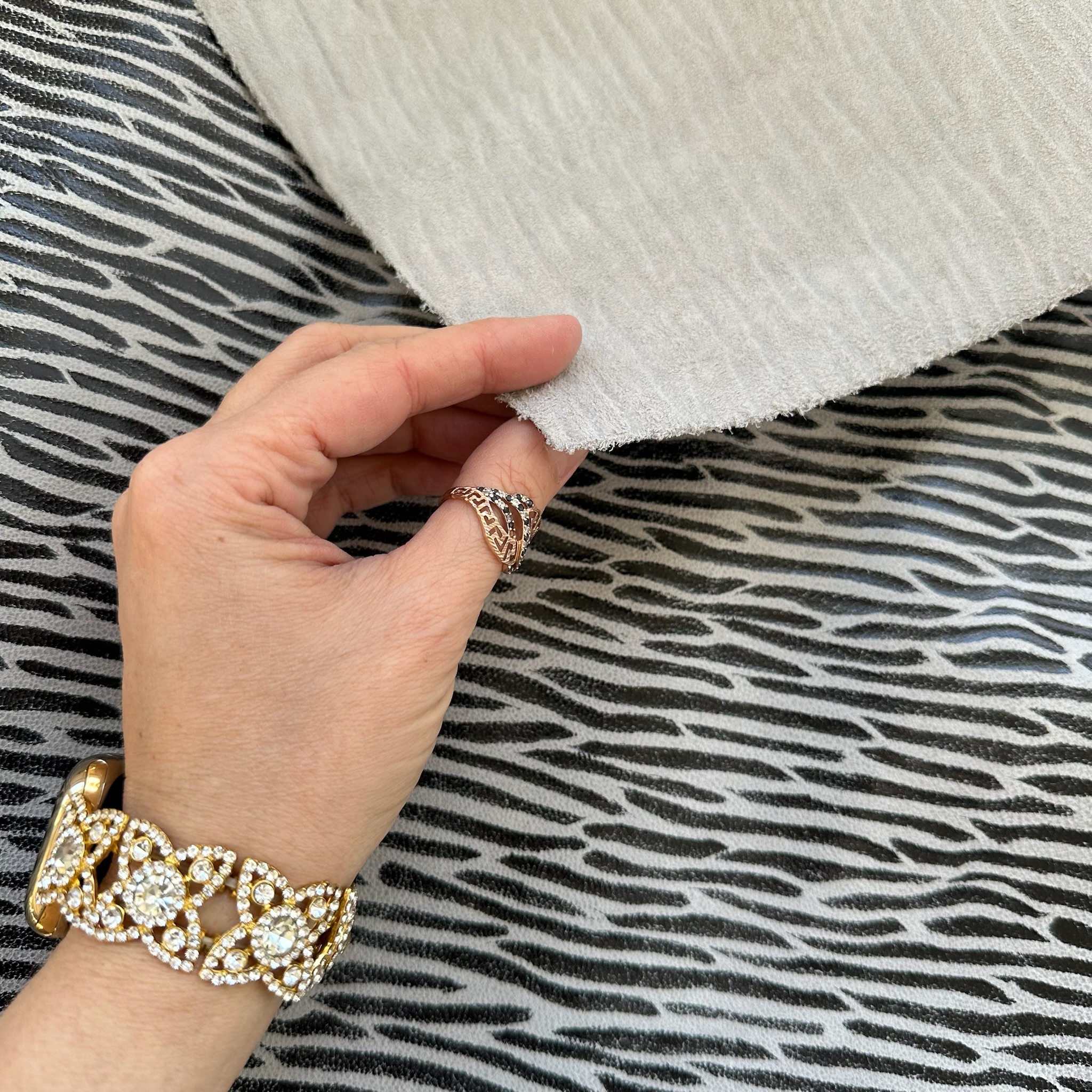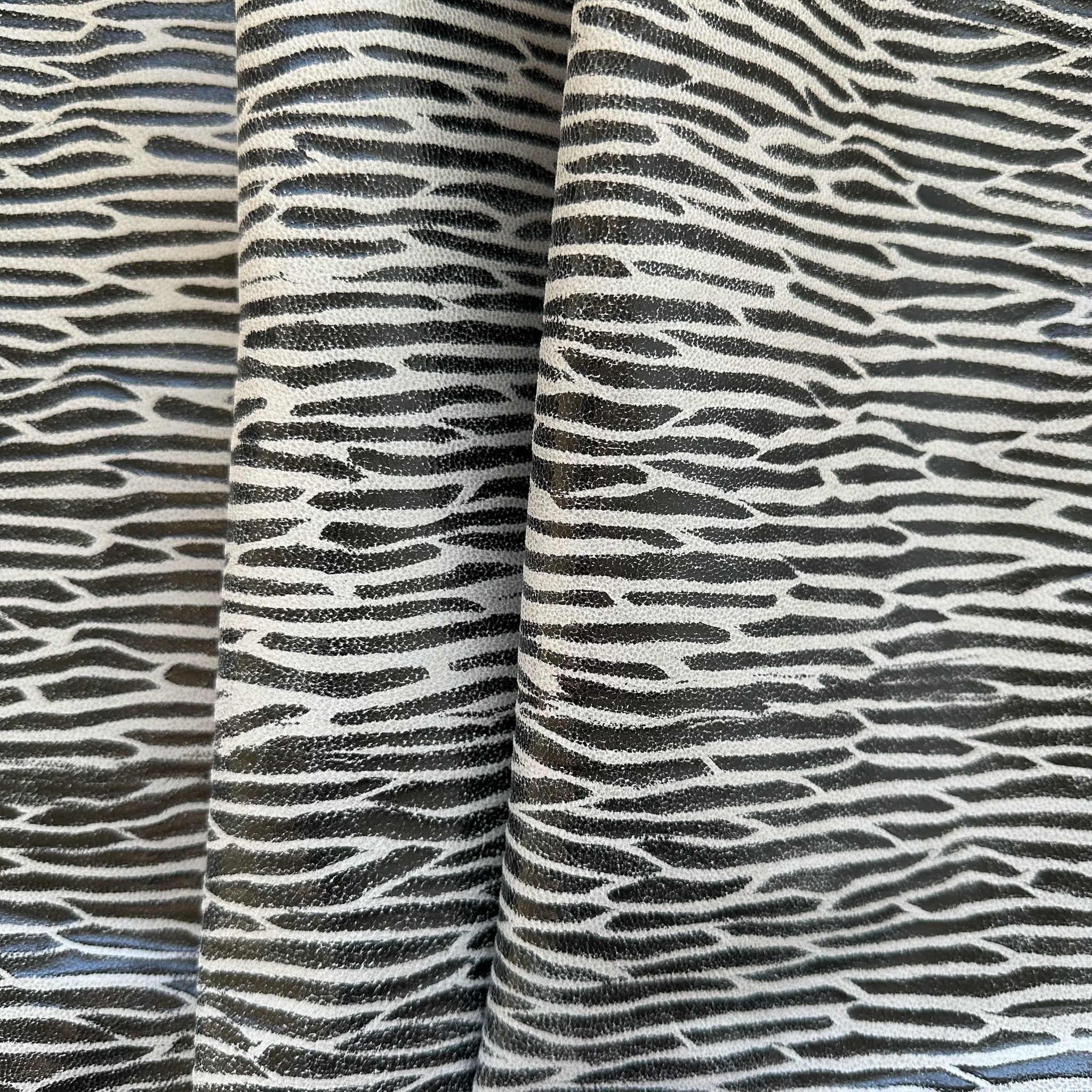 Dieses charaktervolle Rindleder beeindruckt mit einer markanten Zebraprägung in einem hellen Grauton mit schwarzen vorgeprägten folierten Streifen. Die leicht angedeutete 3D Struktur erzeugt eine luxuriöse, exotische Optik – ideal für anspruchsvolle Lederarbeiten mit einem Hauch Extravaganz.